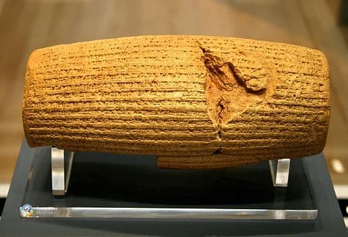 Овој персиски артефакт од 6 век п.н.е. содржи декрет од цар Кир кој дозволува враќање на прогонетите народи, вклучувајќи ги и Евреите. Тоа го потврдува библиското сведоштво во Книгата на Езра за враќањето на Евреите во Ерусалим.