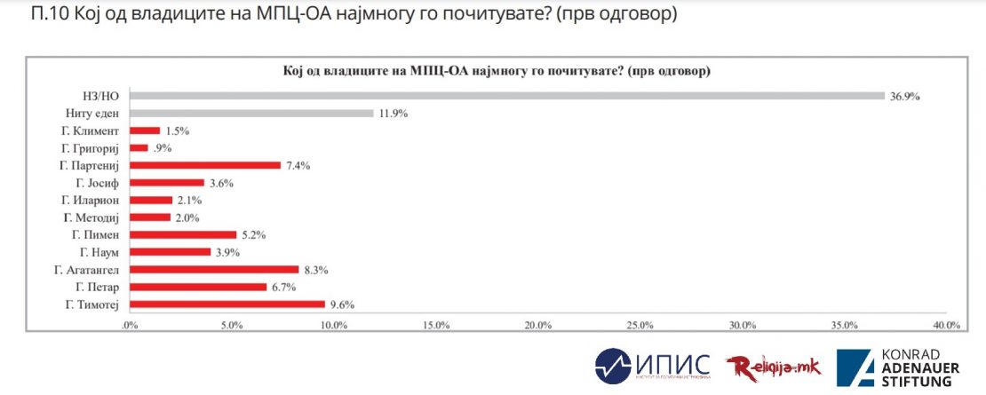 На прашањето „Кој од владиците на МПЦ-ОА најмногу го почитувате“?, испитаниците требаше да се изјаснат без притоа да им бидат прочитани имињата на Владиците, а имаа право на два одговора.