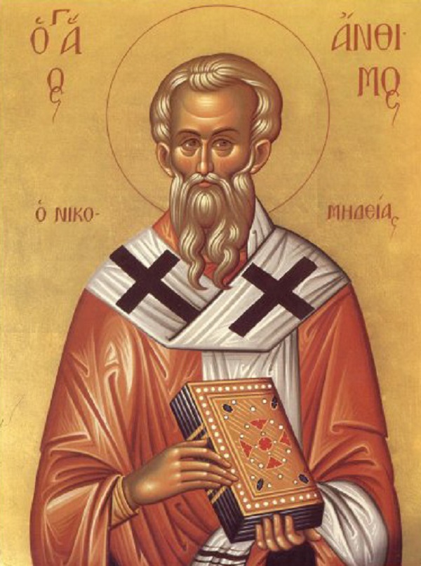 Роден е во Никомидија и од детството воспитан како вистински христијанин. Телото му беше умртвено, духот смирен, зависта искоренета, гневот скротен, мрзливоста протерана,… имаше љубов кон сите, мир со сите; благоразумност покрај с ѐ , ревност кон славата Божја, јавна за сите. Не е чудо што човек со такви добродетели беше поставен за епископ. Свети Антим епископствуваше во Никомидија во времето на лутото гонење на христијаните под свирепите цареви Диоклецијан и Максимијан. Особено во Никомидија христијанската крв се лееше во потоци. Една година на денот на Христовото Рождество во еден храм беа изгорени дваесет илјади маченици (види под 28 декември). Тоа се случи во времето на архиерејството на Антим. Но гонењето не заврши со тоа, туку продолжи, па мнозина христијани беа фрлени во затвор и така чувани за маки и убивање. Свети Антим се оддалечи во едно село, Оман, не за да ѝ побегне на смртта, туку за да може оттаму да го храбри своето стадо во подвигот на мачеништвото, за никој да не отпадне заради страв. Едно од неговите писма до христијаните во затворот го фатија и му го предадоа на царот Максимијан. Царот испрати дваесет војници да го фатат и да го доведат Антим. Белокосиот проѕорлив старец им излезе во пресрет на војниците, ги воведе во својот дом и ги нагости, па дури потоа им кажа дека тој самиот е Антим когошто тие го бараат. Восхитени од неговата добрина војниците му предлагаа да се скрие, а тие да му речат на царот дека не можеле да го најдат. Но Антим им одговори дека тој не смее да дозволи со лага да се престапува заповедта Божја и да се спасува неговиот живот, туку појде со нив. Патем војниците поверуваа во Христа и примија крштение од овој епископ. Изведен пред царот Свети Антим баше долго и луто измачуван, а најпосле го исекоа со секира. Го прослави Господа и се упокои во Него во почетокот од 4 век.
