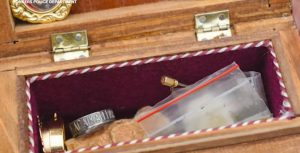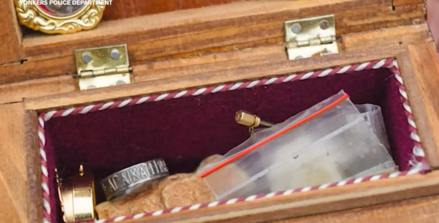 Во мало дрвено ковчеже со платнена црвена внатрешност се наоѓале реликвии, меѓу кои сребрен прстен, златести предмети и мала проѕирна кесичка со бела супстанција.