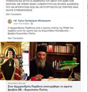 Тој на својот фејсбук профил ја споделил веста за наградата на о. Партениј, со следниов коментар: