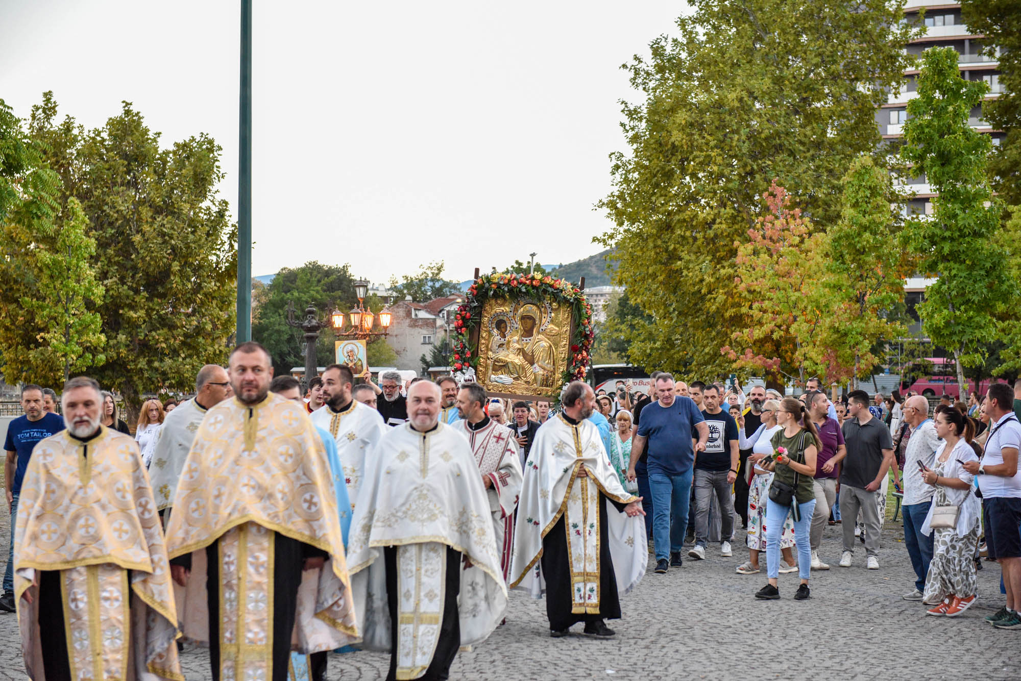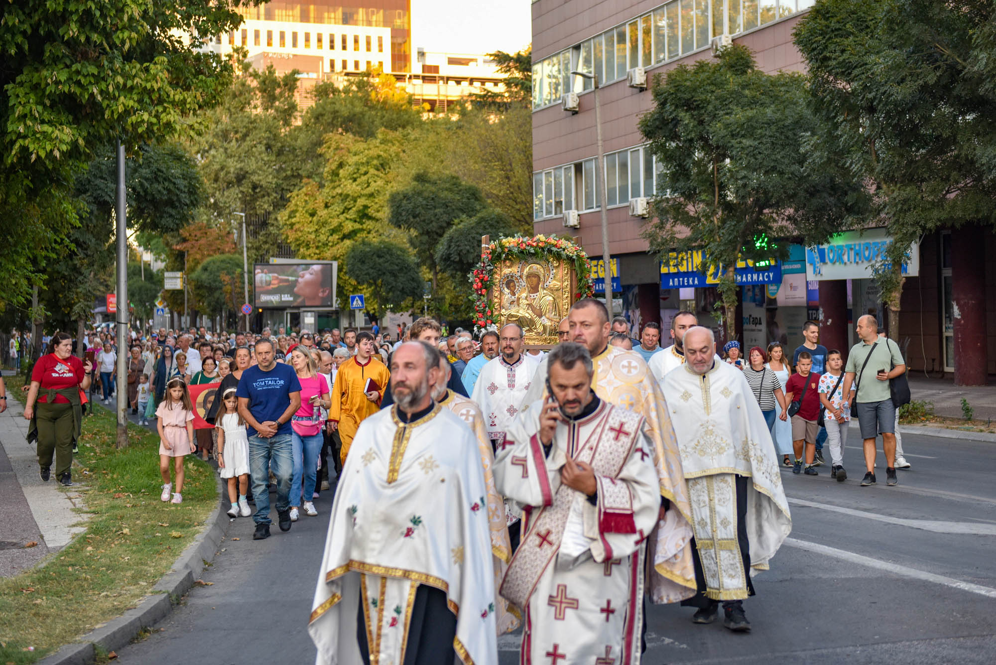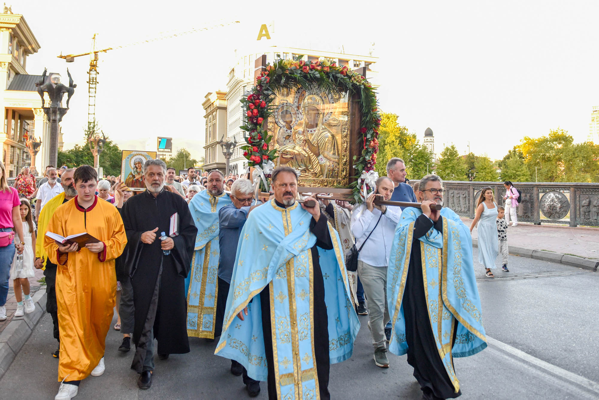 По вечерната Богслужба, со која чиноначлствуваше архиепископот Стефан, беше изнесена иконата на Пресвета Богородица – Троеручица. Литијата почна од храмот „Рождество на Пресвета Богородица“ во Скопје и помина низ централното градско подрачје повторно до храмот.