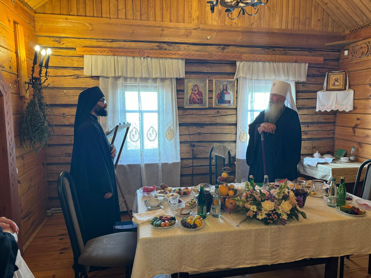 -По завршување на богослужбата следеше заеднички ручек во манастирската трпезарија. Присутните имаа можност, накратко, да се запознаат со историјата и со актуелната состојба на православието во Македонија. Митрополитот Тихон му порача на јеромонах Атанасиј да го пренесе неговиот поздрав и поклон пред православниот македонски народ, објави литургија.мк