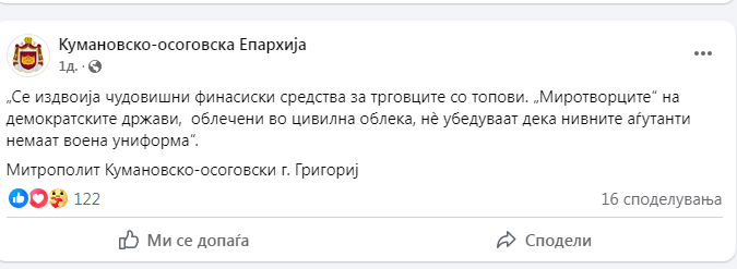 -Се издвоија чудовишни финасиски средства за трговците со топови. „Миротворците“ на демократските држави, облечени во цивилна облека, нѐ убедуваат дека нивните аѓутанти немаат воена униформа“. Митрополит Кумановско-осоговски г. Григориј, објави КОЕ.