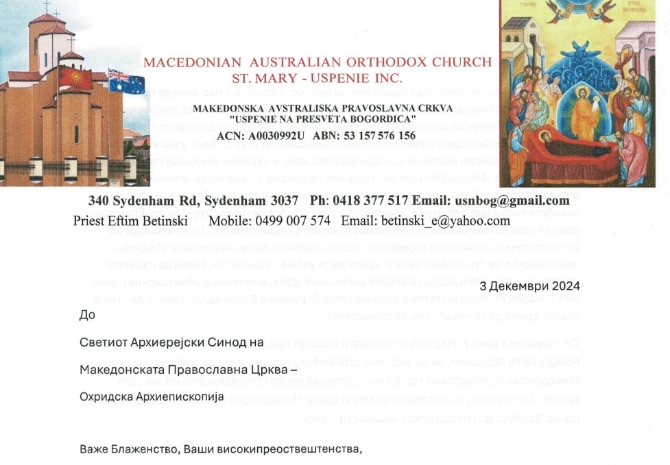 Писмото е поддржано и од Македонската православна заедница од Сиднеј, која управува со два од најголемите храмови во Австралија, кадетралата Св. Кирил и Методи во централната сиднејска населба Розбери и црквата Св Никола во населбата Кабрамата.