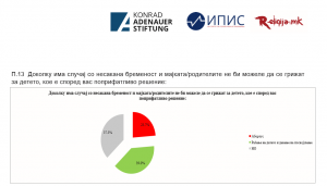 Загрижувачки резултати за перцепцијата на младите во поглед на несаканата бременост открива последното истражување на јавното мислење поврзано со религиозноста на младите во Македонија, спроведено од Институтот за политички истражувања Скопје, „Конрад Аденауер“ и порталот Религија.мк. Речиси една четвртина од младите одговориле дека ќе абортираат ако се соочат со несакана бременост. На прашањето доколку има случај на несакана бременост на што би се одлучиле, 23,7 отсто од испитаниците млади го избрале абортусот како опција. Дополнително, 39 отсто како опција за ваква ситуација би одбрале раѓање на детето и негово давање на посвојување, а 37,3 отсто од младите, пак, не знаат што би направиле во таква ситуација. Но интересен е податокот дека во исто време, речиси половината, или 46,9 отсто од младите, за себе сметаат дека се целосно религиозни, а кога на таа бројка ќе се додаде и бројката 36 отсто, колку што велат дека донекаде се религиозни, се доаѓа до еден висок процент на млади за кои религијата треба да има важна улога во животот, што, според многумина, е неспоиво со горенаведените ставови за абортус.