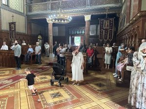 Црковната литургија ја одржа јеромонахот Дионисиј Богев од манастирот Беркасово во Срем, за што има добиено благослов од надлежните епископи на Српската православна црква (СПЦ), сремскиот епископ Василиј и банатскиот епископ Никанор, надлежен за црквата Св.Пророк Илија во Јабука, каде има најголема концетрација на Македонци во Србија.
