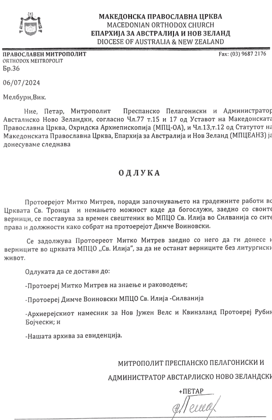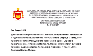 -Со длабока трпеливост ја очекуваме одлуката од Светиот Синод за префрлање на нашата Парохија Свети Пророк Илија Силванија, Австралија, заедно со нашиот парохиски свештеник, протоереј Димче Воиновски во Австралиската- Сиднејска Епархија. Со огромна болка, плач и почит апелираме лично до нашиот Архиепископ, Неговото Блаженство Архиепископот г.г. Стефан да ја стави ситуацијата на дневен ред на наредниот Синодски Состанок, и по Божја Волја и напор од сите нас, во најкраток период Свети Пророк Илија Силванија, Австралија заедно со Протоереј Димче Воиновски да бидат префрлени во Македонската Православна Црква Австралиско – Сиднејска Епархија. И по Божја Помош некој ден да не удостој во овај наш шести континент, сите да не Благослови со стален надлежен Владика каде ќе си живеј по меѓу нас. Овај краен чекор ќе биди огромен придонес за да се зајакни довербата во лидерството во Македонската Православна Црква и со Божја Помош да ни се вратат верниците што се префрлија во други помесни православни цркви, дури и тие што заминале во сектите, стои во писмото.