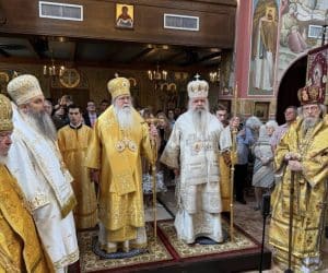 На литургијата сослужуваа многубројни архијереи, свештеници и ѓакони од различни помесни православни Цркви. Молитвено присуствуваше и митрополитот Американско-канадски г. Методиј.