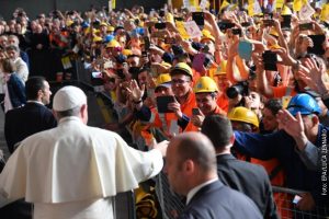 Околу 3.500 работници облечени во работнички одела и со заштитни кациги на главите, се собраа за да го слушаат говорот на папата.