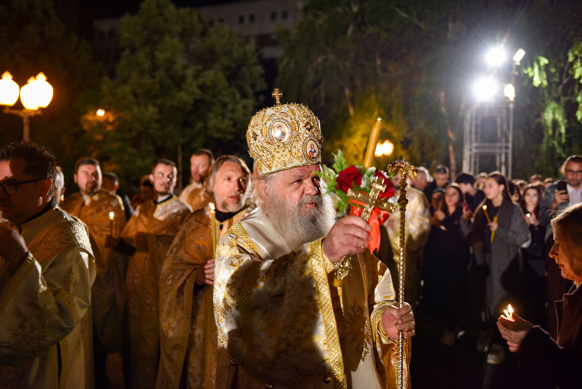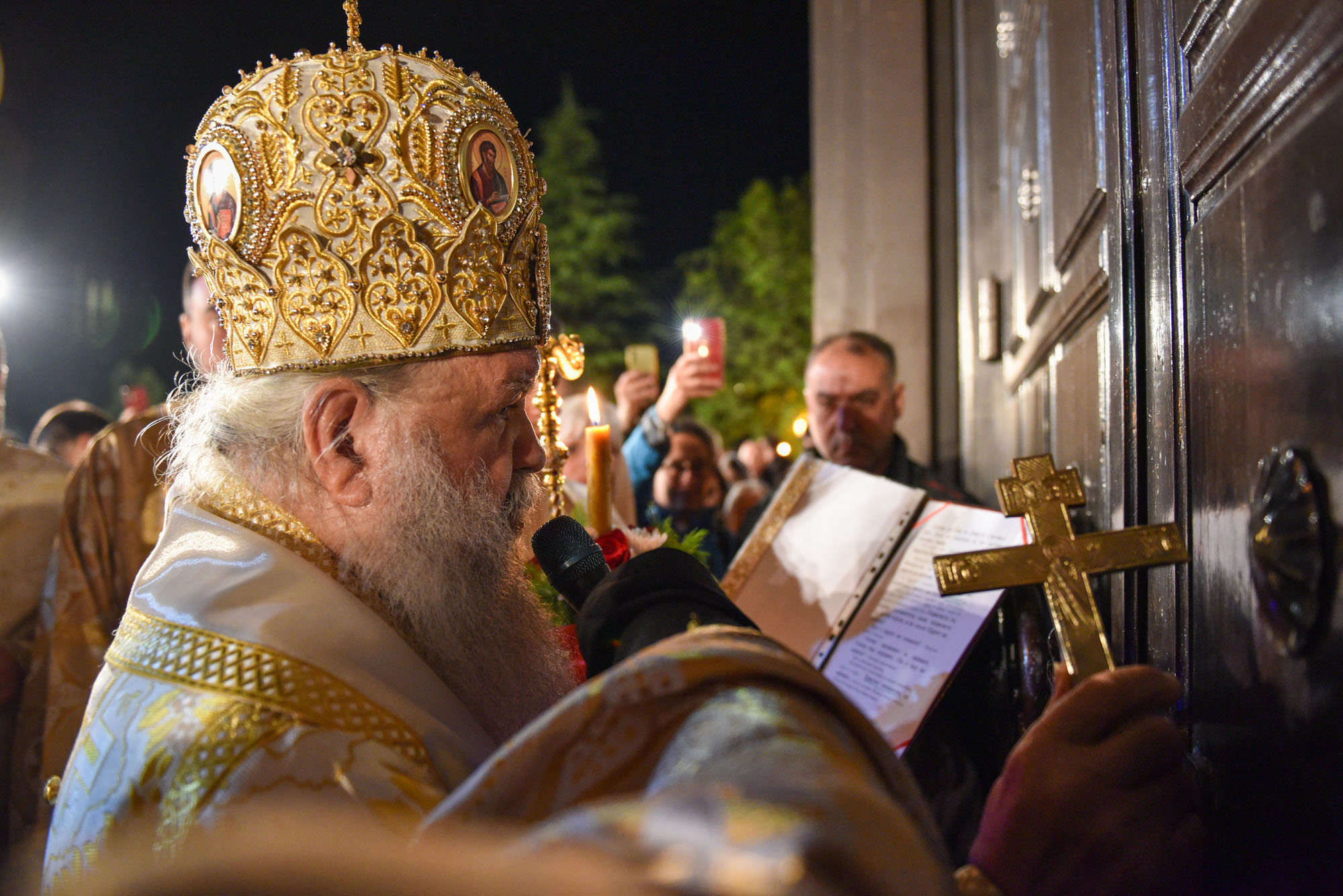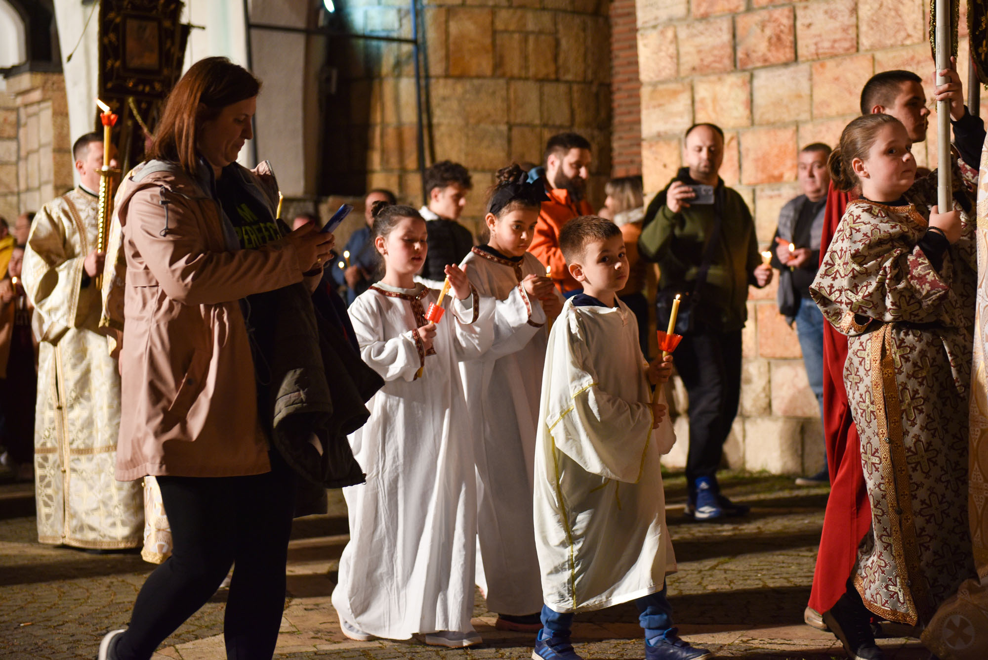 Торжествената прослава на победата на животот над смртта започна во ноќта на 4 спроти 5 мај со раздавање на светиот Благодатен Оган, по што беше отслужена Пасхална Полуноќница. На неа, радосно пеејќи „Воскресението Твое Христе Спасителу, ангелите го воспеваат на небесата, а и нас на земјата удостој нè, со чисто срце да Те славиме“, Архиепископот, свештенослужителите и верниот народ извршија трократен опход околу Соборниот храм. Изутринава, пак, Архиепископот претстојуваше на Пасхалната Литургија на која беше прочитано и Велигденското послание на Светиот архијерејски синод на Македонската Православна Црква. По завршетокот на Литургијата, беше прочитано пасхалното Евангелие на многу јазици. ХРИСТОС ВОСКРЕСЕ!, велат од Скопската епархија.