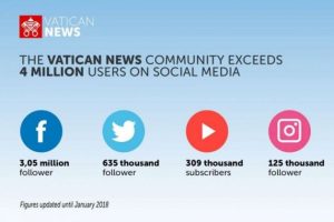 Ватикан соопшти дека своите медиуми под логото на Светиот Престол , посветени на социјалните медиуми за вести надмина 4 милиони корисници на Фејсбук, Твитер, ЈуТјуб.