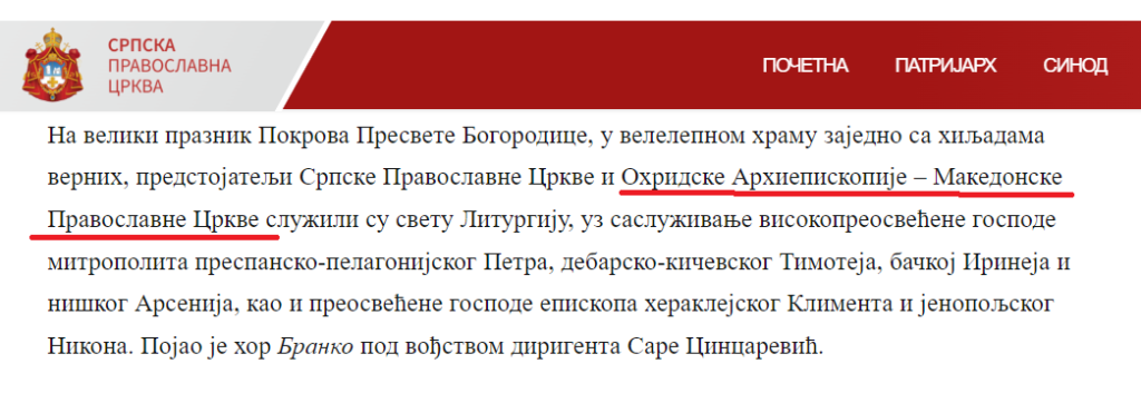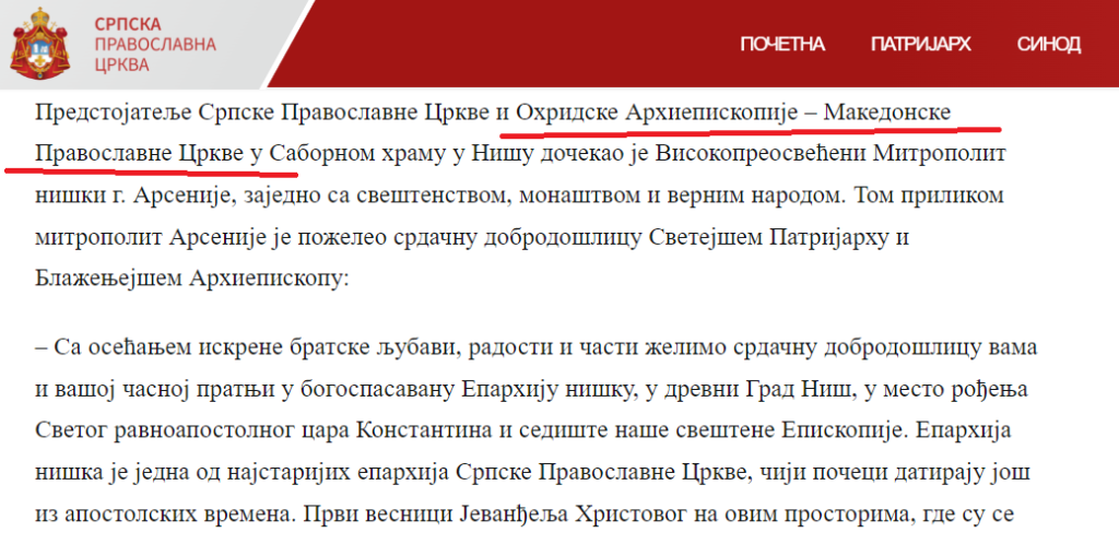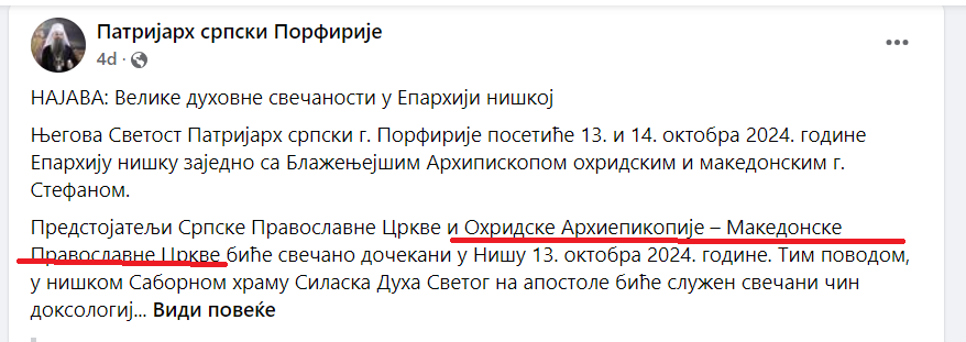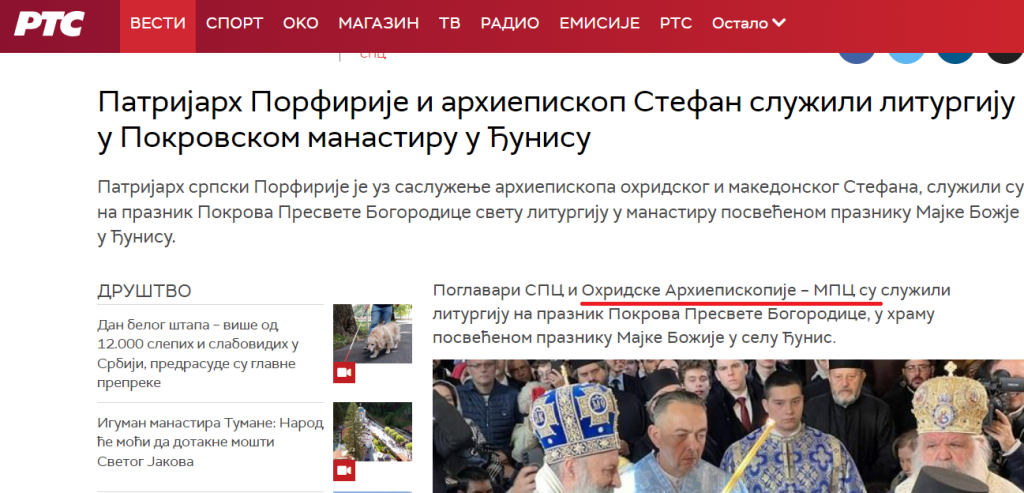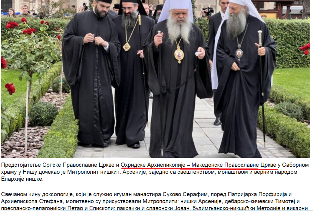 Српската прагвославна црква ја преименува МПЦ-ОА и наместо „Македонска Православна Црква – Охридска Архиепископија“, како што ја признава со Томосот од 2022 година, сега ја нарекува „Охридска Архиепископија – Македонска Православна Црква“. Таквата формулација ја користи изминативе неколку денови, информирајќи за сослужувањето на поглаварите Стефан и Порфириј во Ниш.