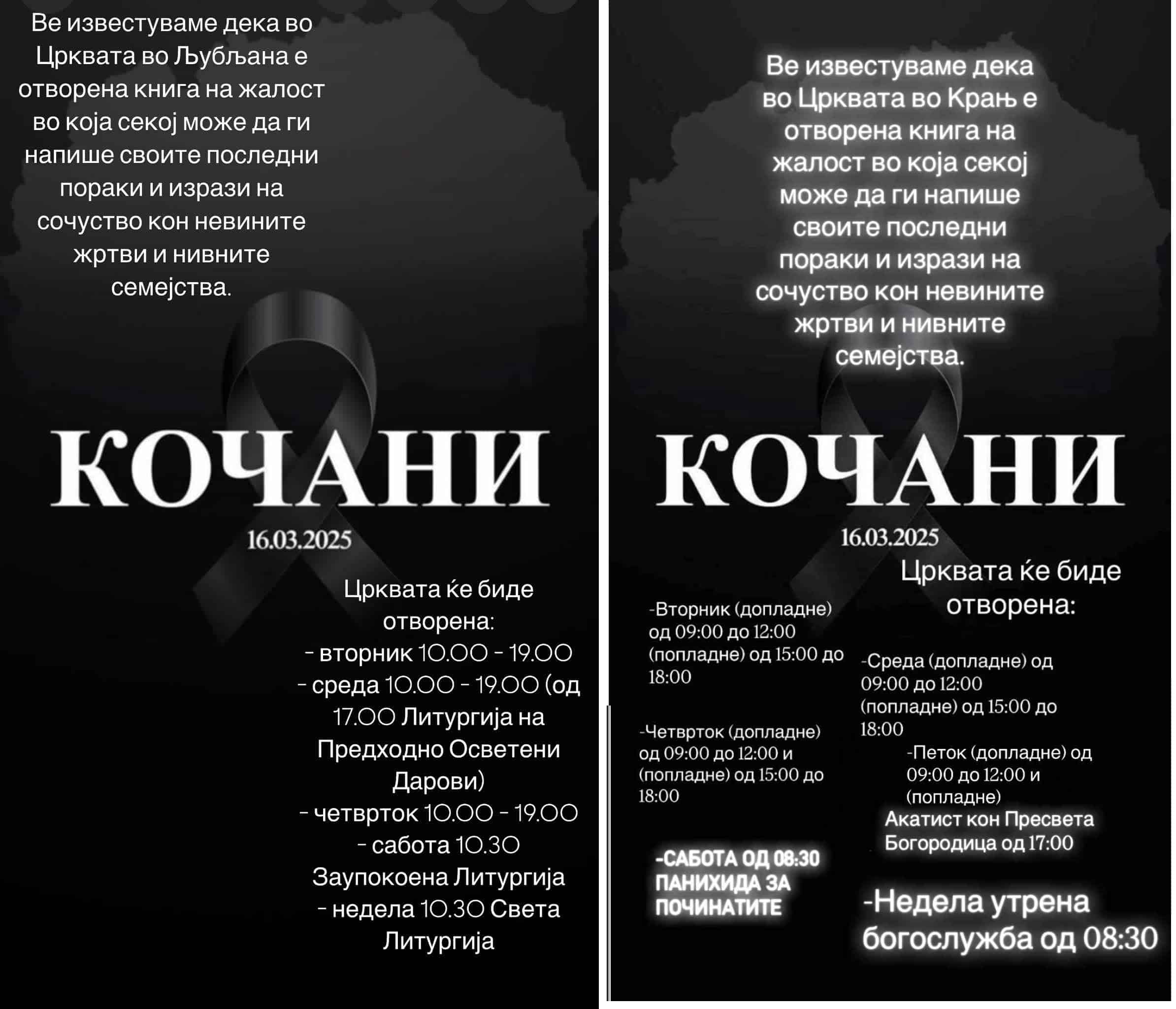 Епархијата за Европа на МПЦ-ОА во Словенија ги отвора вратите на црквите за помош на семејствата на кои им е потребна помош поради лекување на нивните деца од трагедијата во Кочани. Во Сабота во црквите на МПЦ – ОА ќе се служи и заупокоена литургија за загинатите.