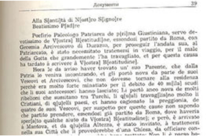 Мошне интересен документ е и писмото испратено од Паштровиќи на 15 февруари 1642 година, во кое Франческо де Леонардис, специјален пратеник на папата, кој чекал да отпатува за Пеќ, каде што со српскиот патријарх требало да преговара за унија на Српската православна црква со Светиот Престол во Ватикан, известува за состојбите на теренот. Во своето доверливо писмо, Леонардис го известува папата дека е принуден да го одложи патувањето за Пеќ, затоа што бил известен дека српскиот патријарх отпатувал за Цариград каде што Охридскиот патријарх се обидува повторно да ги потчини сите поранешни територии под своја јуриздикција, односно “да се прогласи за глава на Бугарија, Србија, Македонија и Босна”.
