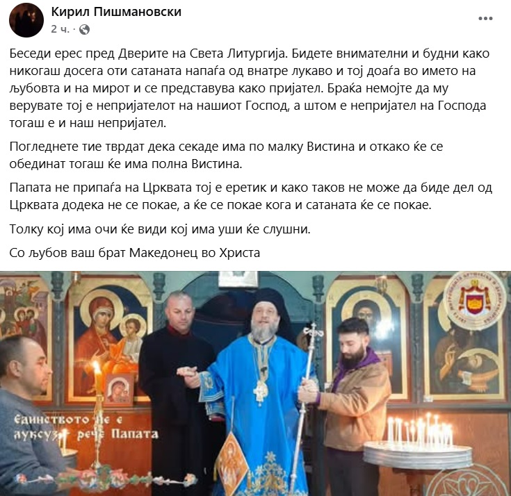-Беседи ерес пред Дверите на Света Литургија. Бидете внимателни и будни како никогаш досега оти сатаната напаѓа од внатре лукаво и тој доаѓа во името на љубовта и на мирот и се представува како пријател. Браќа немојте да му верувате тој е непријателот на нашиот Господ, а штом е непријател на Господа тогаш е и наш непријател. Погледнете тие тврдат дека секаде има по малку Вистина и откако ќе се обединат тогаш ќе има полна Вистина. Папата не припаѓа на Црквата тој е еретик и како таков не може да биде дел од Црквата додека не се покае, а ќе се покае кога и сатаната ќе се покае. Толку кој има очи ќе види кој има уши ќе слушни. Со љубов ваш брат Македонец во Христа, напиша Пишмановски на Фејсбук.