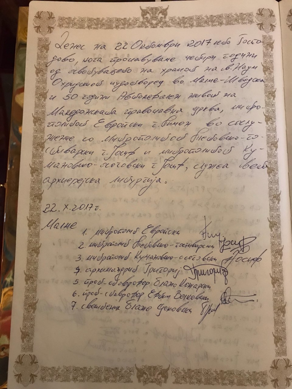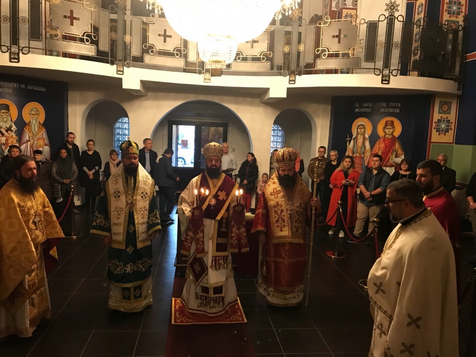Претходно во саботата на 21.10.2017 година со благослов на надлежниот епархиски архиереј на Европската Епархија г. Пимен во храмот свети Наум Охридски во Малме – Шведска, Митрополитот Тетовско-гостиварски г. Јосиф заедно со парохискиот свештеник протоереј-ставрофор Блажо Козарски богослужеа вечерна богослужба.