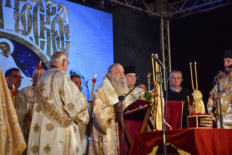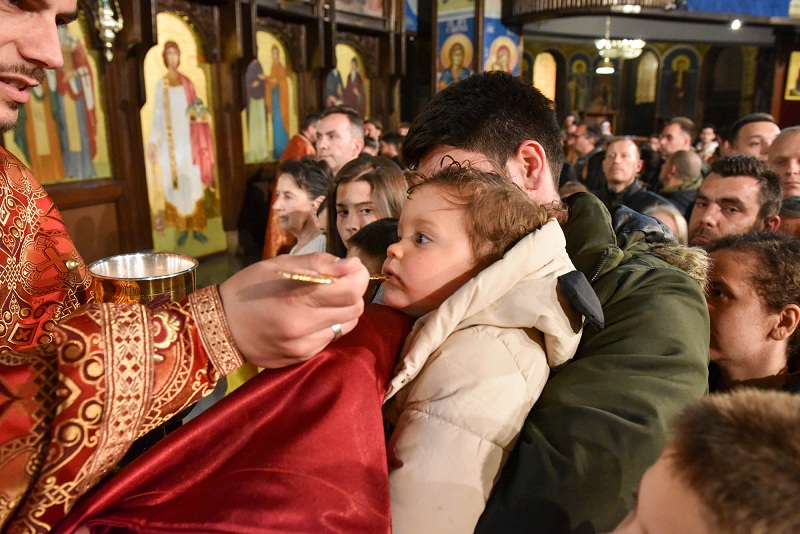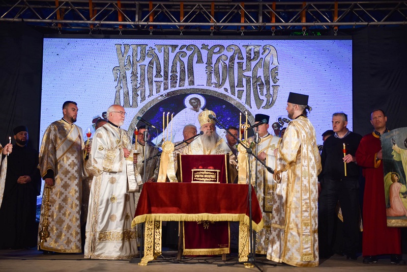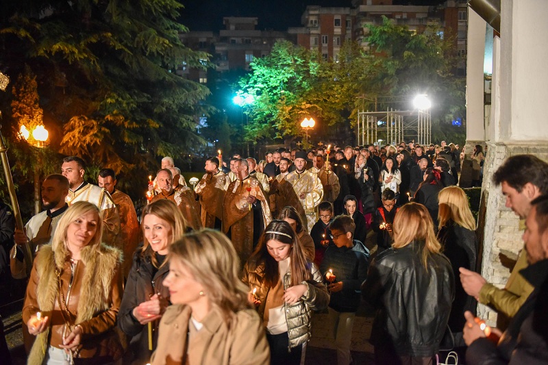 -Торжествената прослава на победата на животот над смртта започна во ноќта на 11 спроти 12 април со раздавање на светиот Благодатен Оган, по што беше отслужена Пасхална Полуноќница. На неа, радосно пеејќи „Воскресението Твое Христе Спасителу, ангелите го воспеваат на небесата, а и нас на земјата удостој нè, со чисто срце да Те славиме“, Архиепископот, свештенослужителите и верниот народ извршија трократен опход околу Соборниот храм. Веднаш потоа, Архиепископот претстојуваше на Пасхалната Литургија на која беше прочитано и Велигденското послание на Светиот архијерејски синод на Македонската Православна Црква, велат од Скопската епархија.