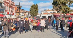 Децата учесници во поворката на Градскиот плоштад „Климент Охридски“ пред поставената божиќна пештера ги пречека градоначалникот Константин Георгиески, кој ги даруваше со божиќни пакетчиња.
