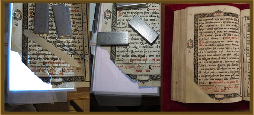 – Беше одлучено да се користи методот на санација при која ќе се задржи последниот изглед на книгата, а реставрацијата беше спроведена во текот на четириесет дена. Грбот беше зацврстен, хартијата исчистена од прашина и восок, сите искинати и нагризани делови од хартијата и дрвото беа надополнети, се стави нова прекривка од кадифе, а металните украсни делови беа поправени и повторно позлатени. Сите интервенции – лепење, шиење и сл, се извршија на истиот начин кој се користел во времето на создавање на книгата, односно на нејзиното прво реставрирање, а за надополнување се користеше рачно изработена јапонска хартија со тежина како оригиналната, велат од Бигорскиот манастир.