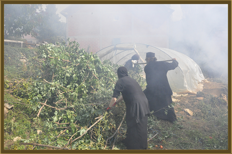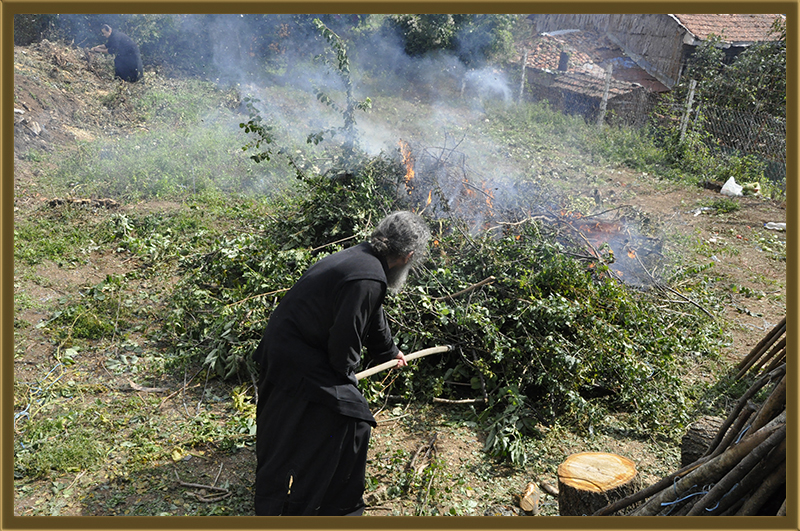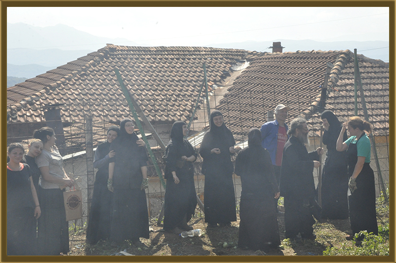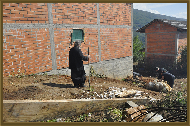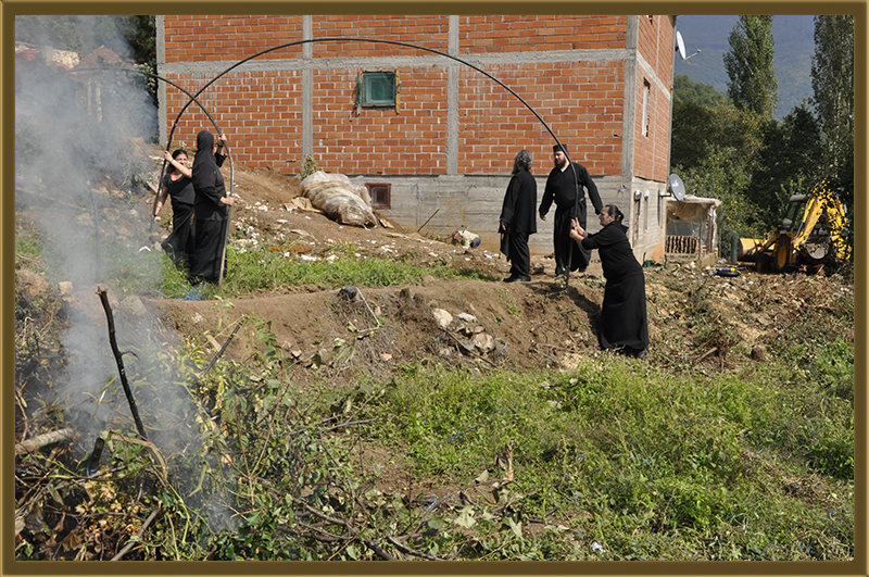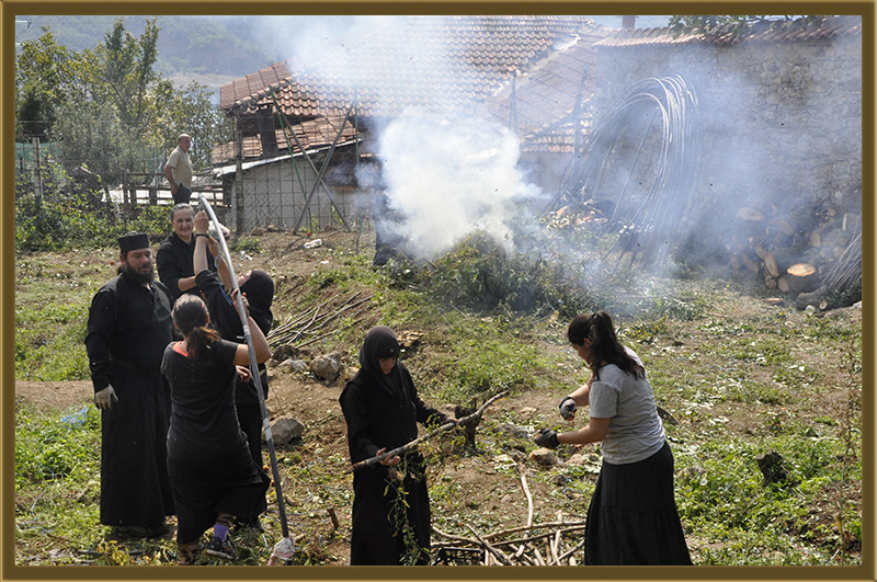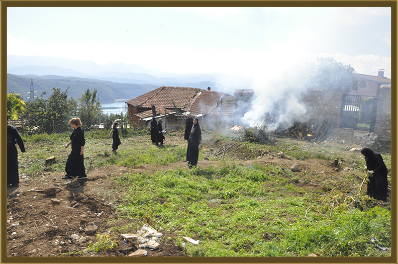 Архимандритот Партениј, монасите од Бигорски и монахињите од Рајчица, заедно со верници кои помагаат на Бигорската Обител во викедн работна акција. Заеднички го расчистувале теренот каде во вторник ќе биде поставен камен темелник на нов монашки конак, а воедно го подготвувале манастирот за манастирската слава за Крстовден.