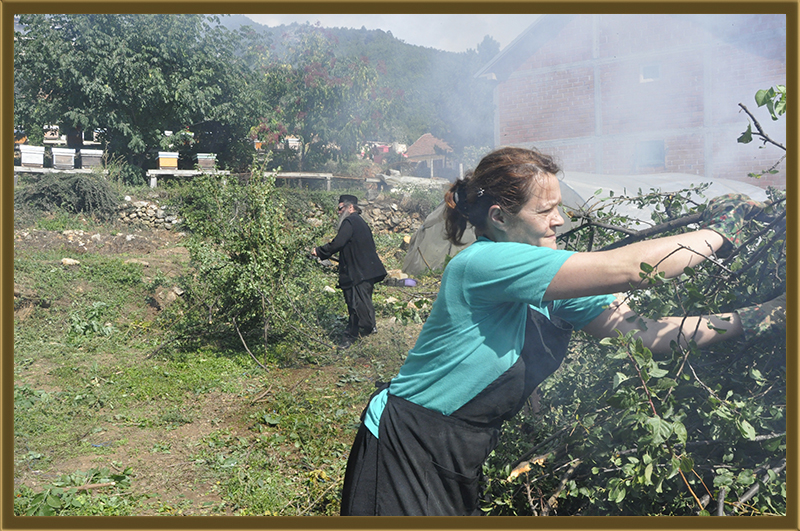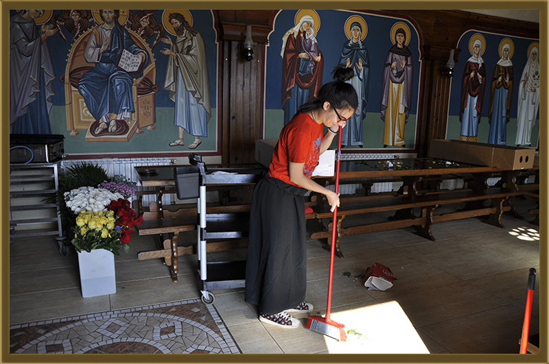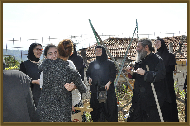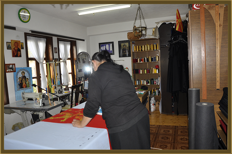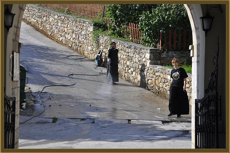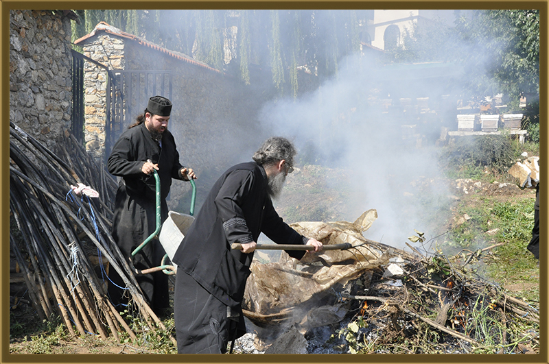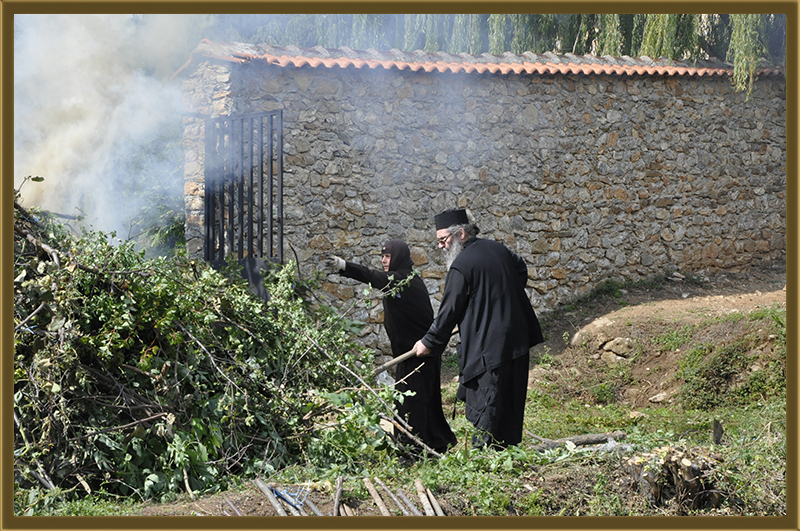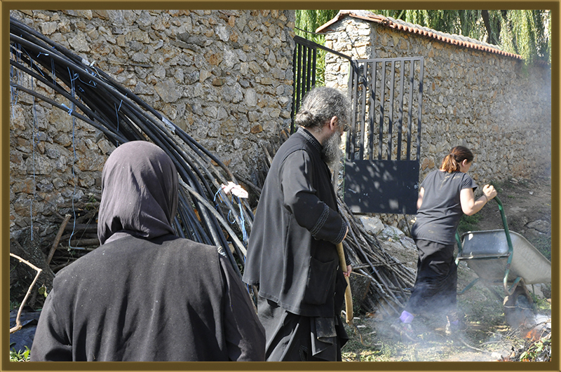 Архимандритот Партениј, монасите од Бигорски и монахињите од Рајчица, заедно со верници кои помагаат на Бигорската Обител во викедн работна акција. Заеднички го расчистувале теренот каде во вторник ќе биде поставен камен темелник на нов монашки конак, а воедно го подготвувале манастирот за манастирската слава за Крстовден.