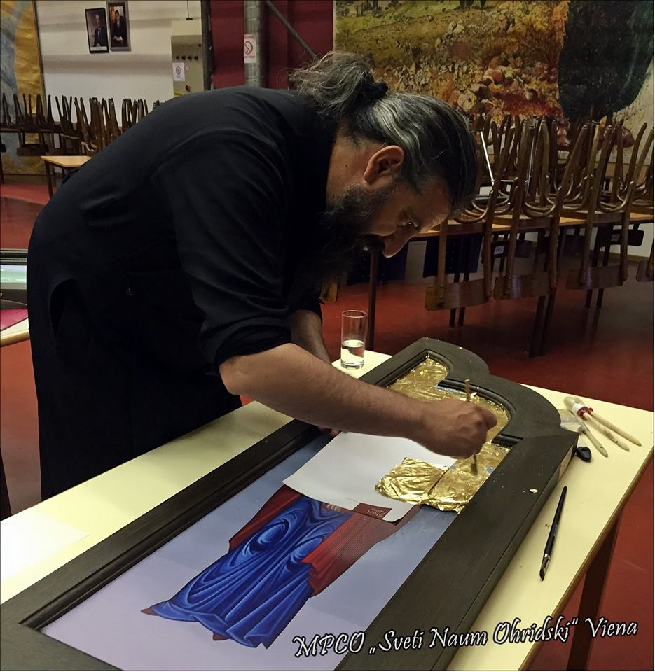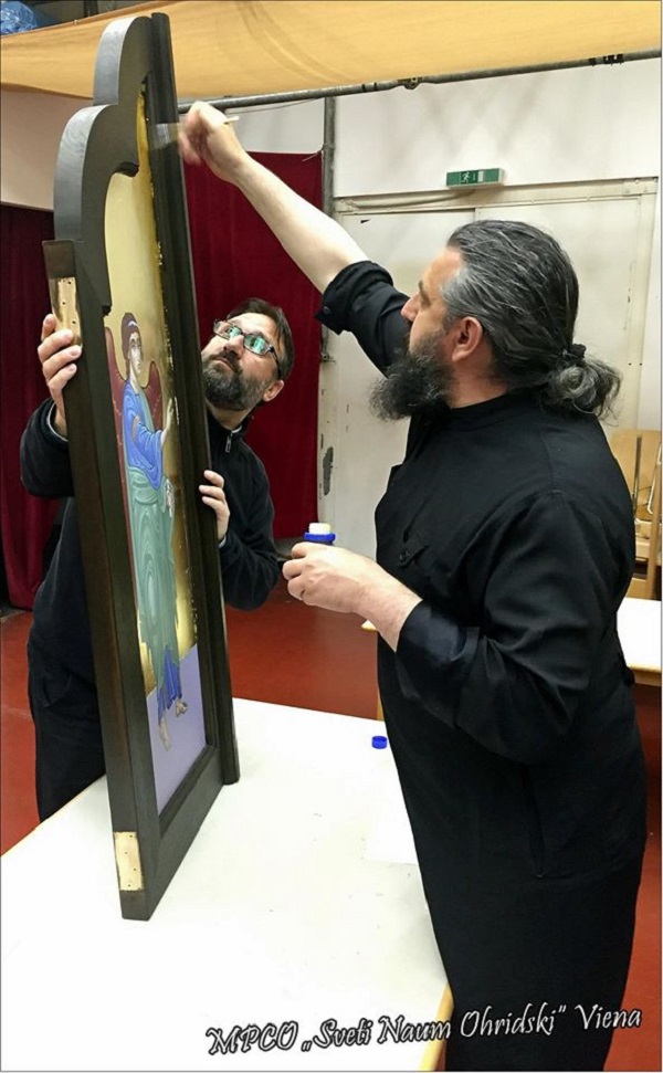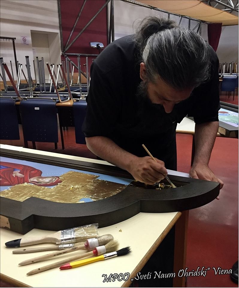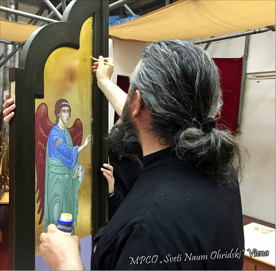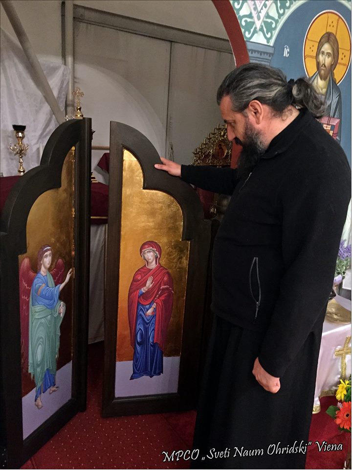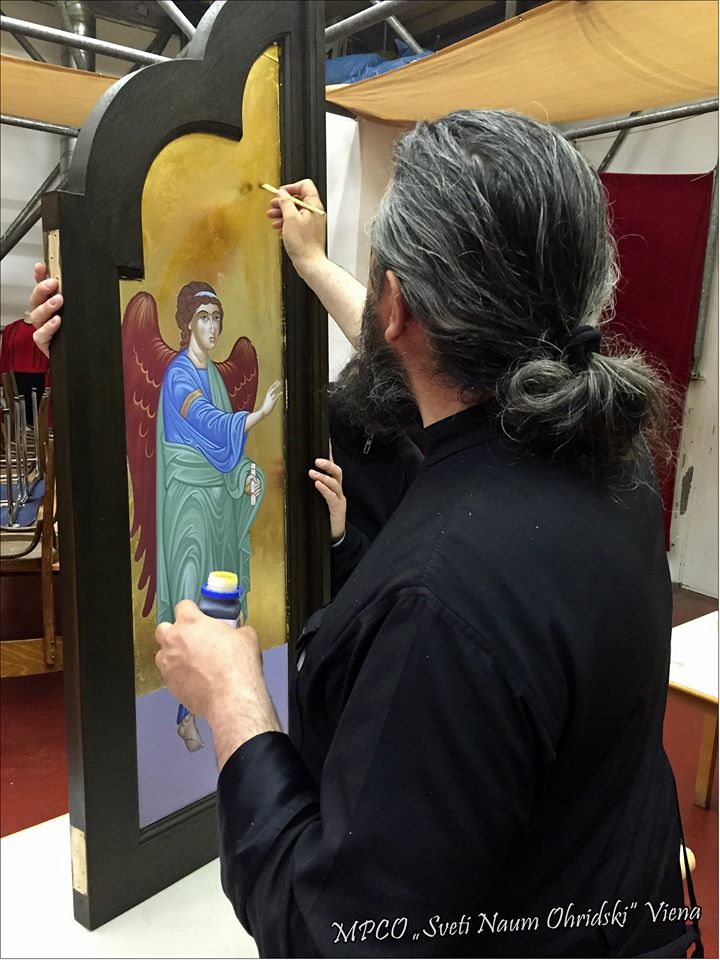 Македонската црковна општина „Свети Наум Охридски“ од Виена објави фотографии од надлежниот митрополит Пимен, кој со боја и четка во рацете ги доуредува и доукрасува иконите од царските двери, или светите порти, од иконостасот на црквата.