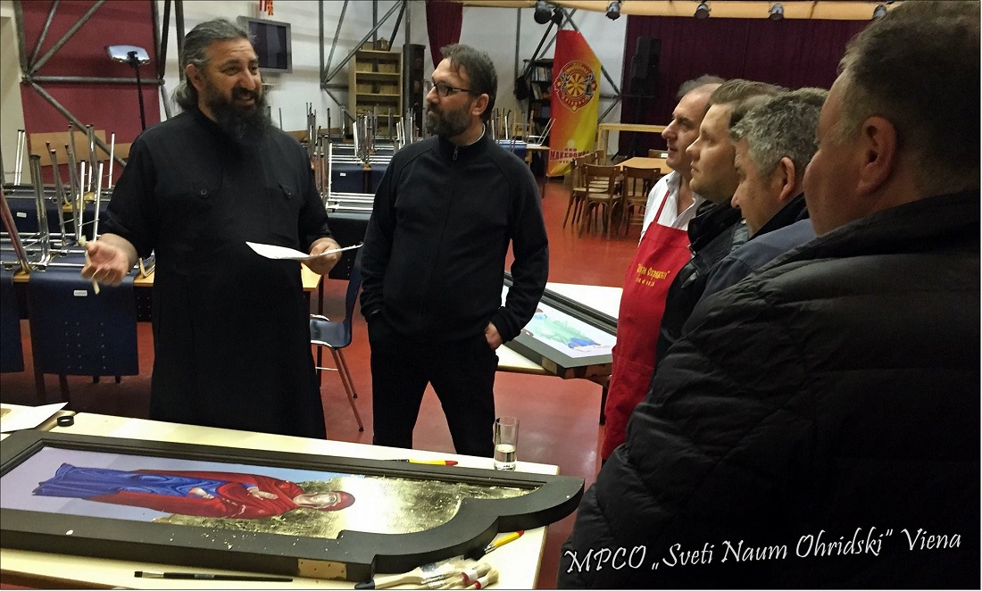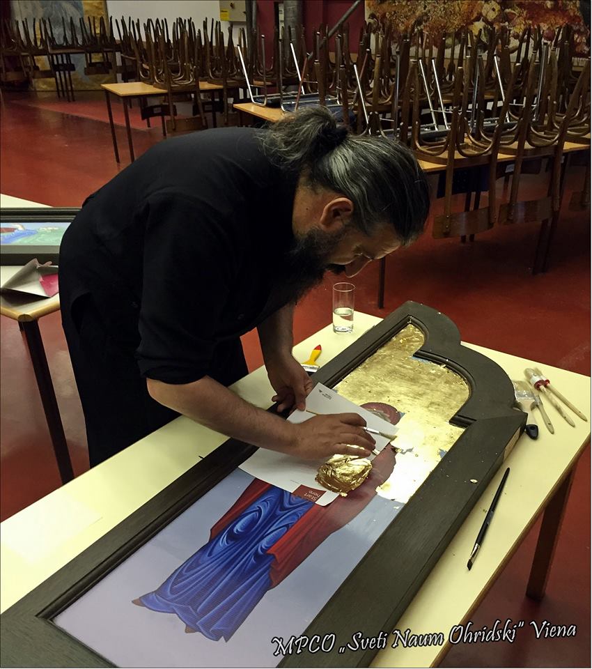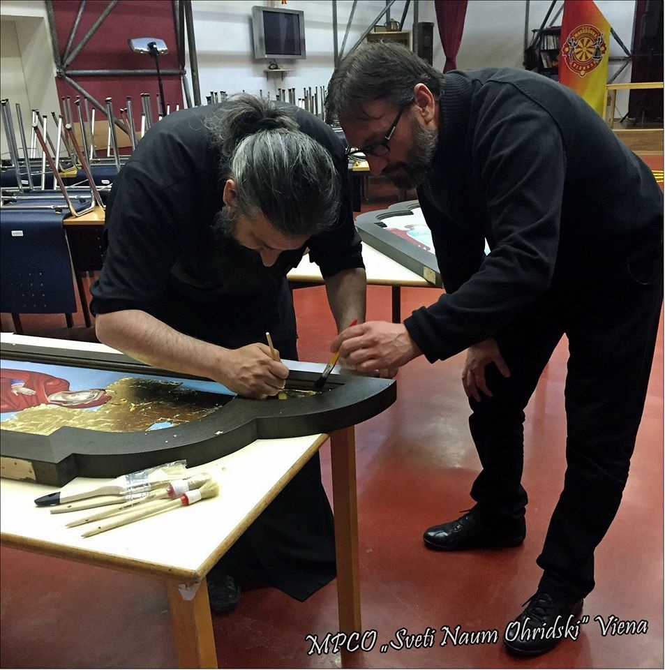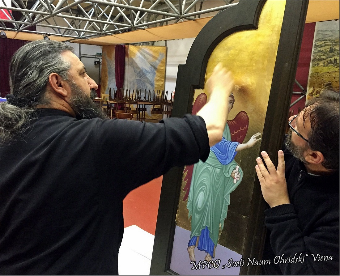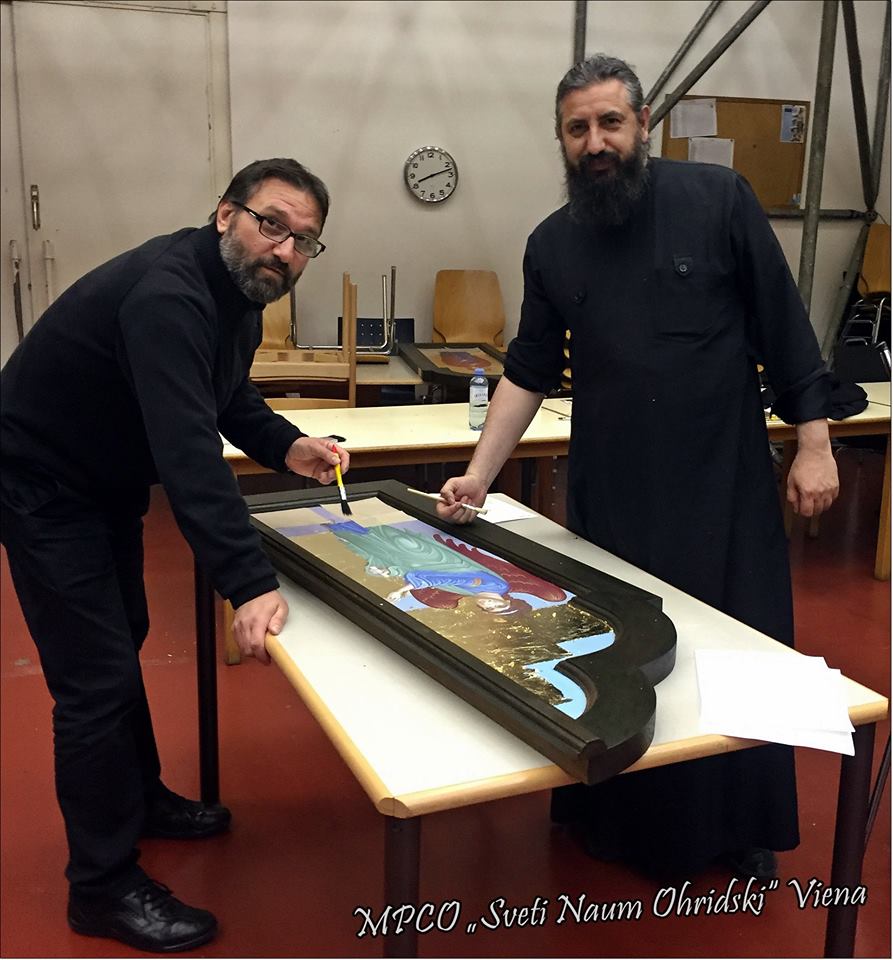 Македонската црковна општина „Свети Наум Охридски“ од Виена објави фотографии од надлежниот митрополит Пимен, кој со боја и четка во рацете ги доуредува и доукрасува иконите од царските двери, или светите порти, од иконостасот на црквата.
