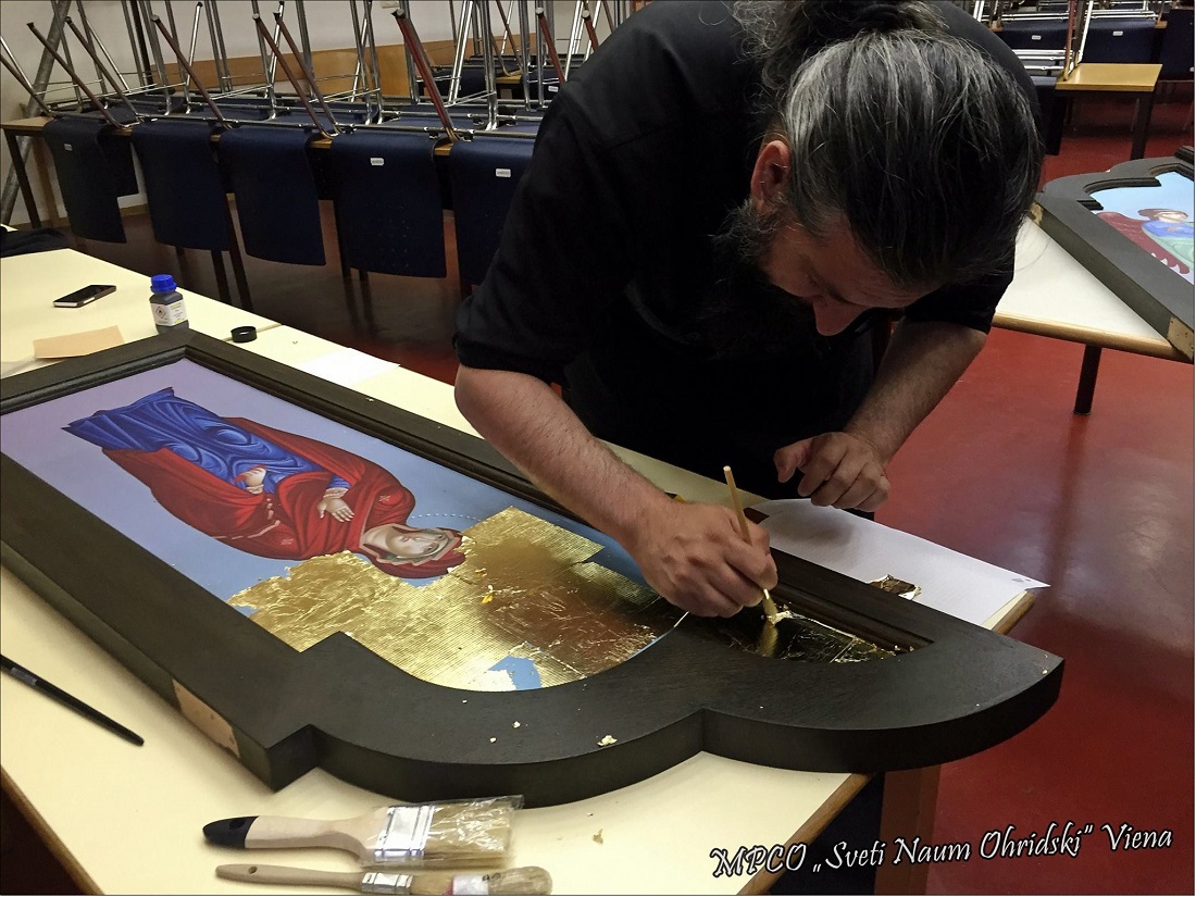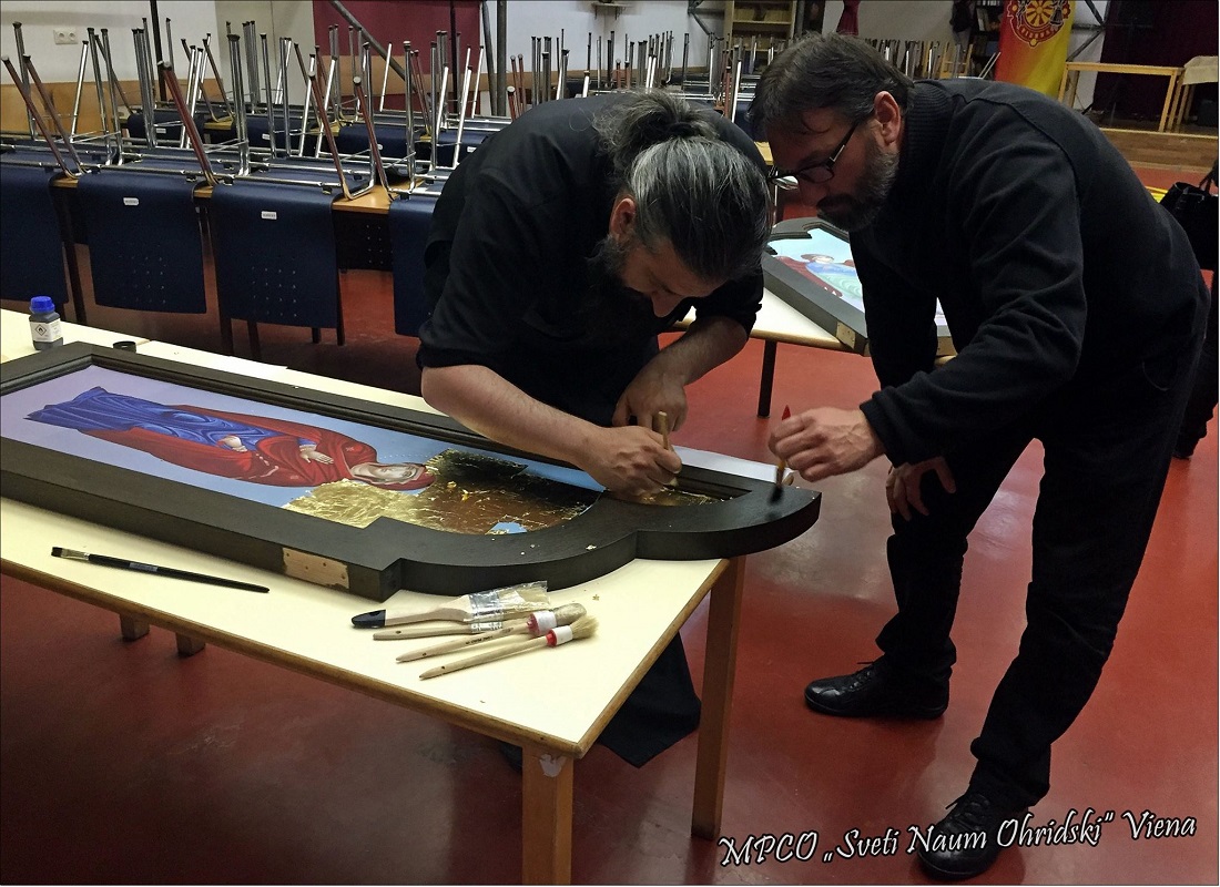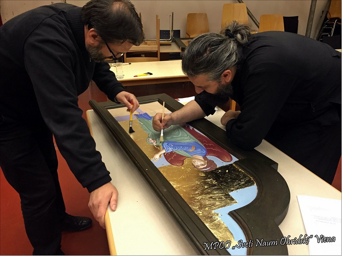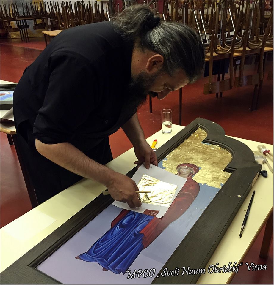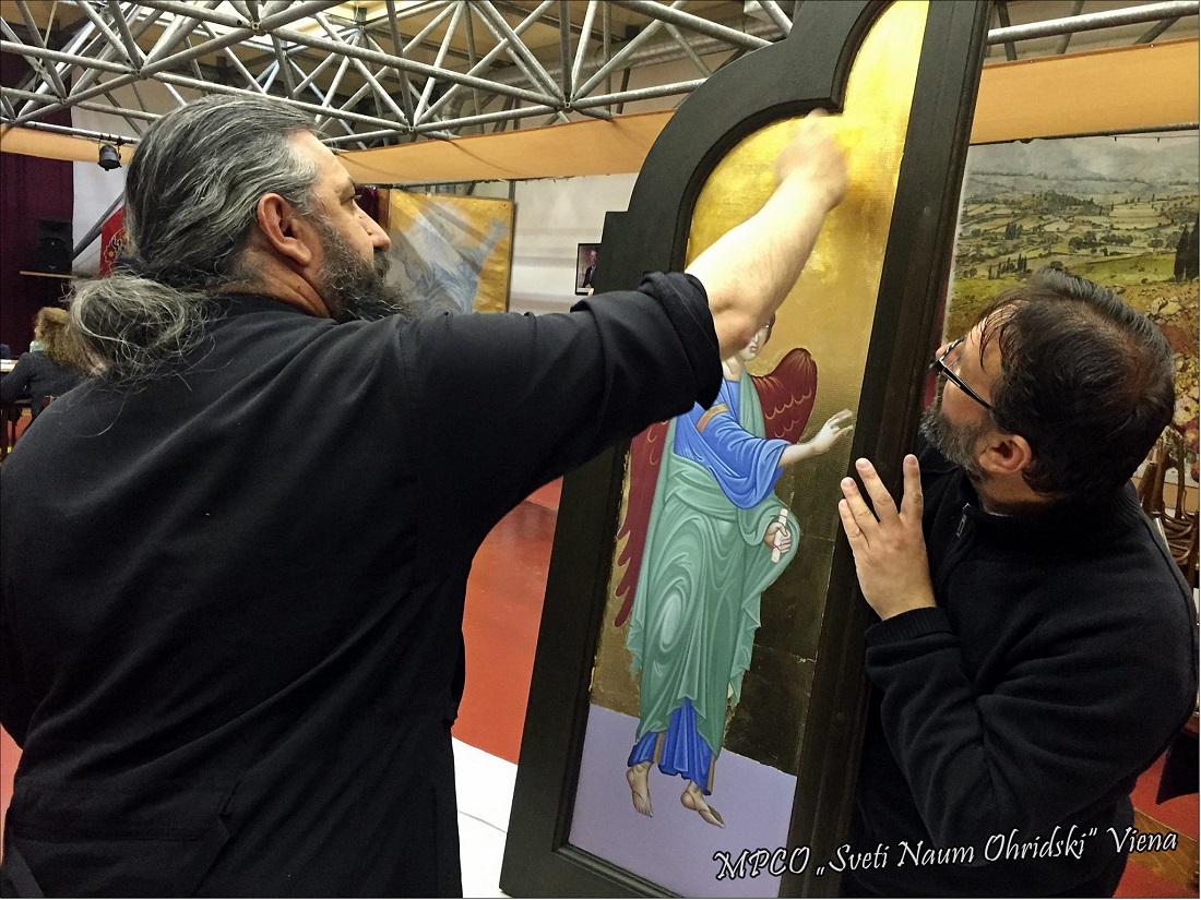 Македонската црковна општина „Свети Наум Охридски“ од Виена објави фотографии од надлежниот митрополит Пимен, кој со боја и четка во рацете ги доуредува и доукрасува иконите од царските двери, или светите порти, од иконостасот на црквата.