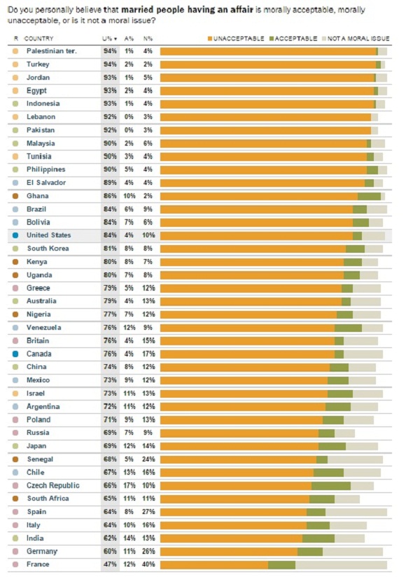 Според ова истражување во светот владее глобално мислење дека најнеморални се „вонбрачните афери“, или популарните „швалерски врски“. Дури 78 % од испитаниците, нив ги оцениле како „неприфатливи“. Ги одобруваат само 7%.