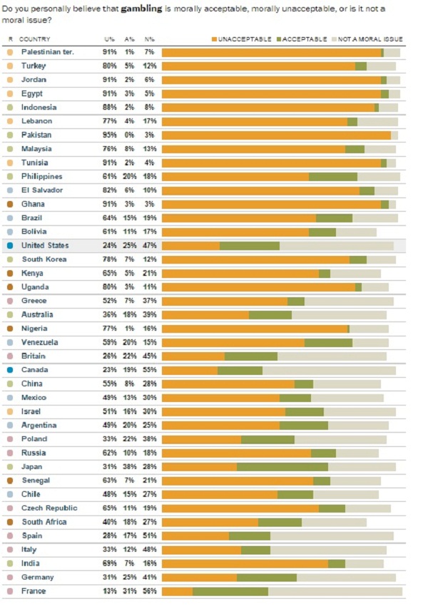 За разлика од ова, за прашањето за „Коцкањето“ САД, Канада и Франција се наоѓаат на дното од скалата, со низок процент на „неприфатливост“.