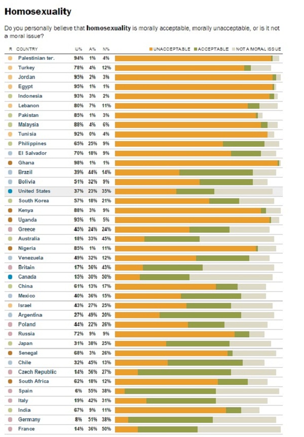 Со високи 98% од испитаниците „хомосексуалноста“ се оценува како „неморална“ во речеси сите држави со доминатно муслиманско население. Тој процент е екстремно нисок под 10% во земјите од Западна Европа. Соединетите американски држави и овде се со интересни податоци. За ова прашање во САД владее опшата поделеност.