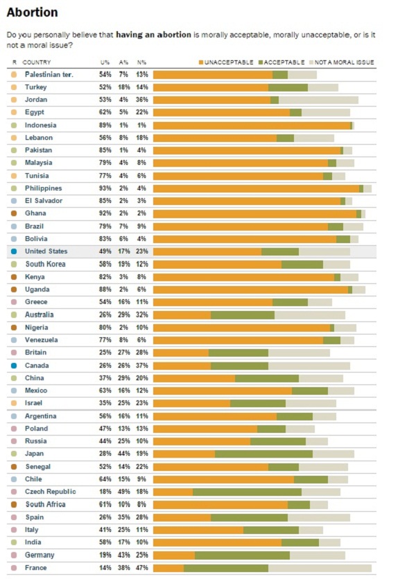Слична е состојбата и во анализата по држави за прашањето за „Абртусот“, со тоа што на пример во САД, речиси 50% од испитаниците абортусот го оцениле како неморален.