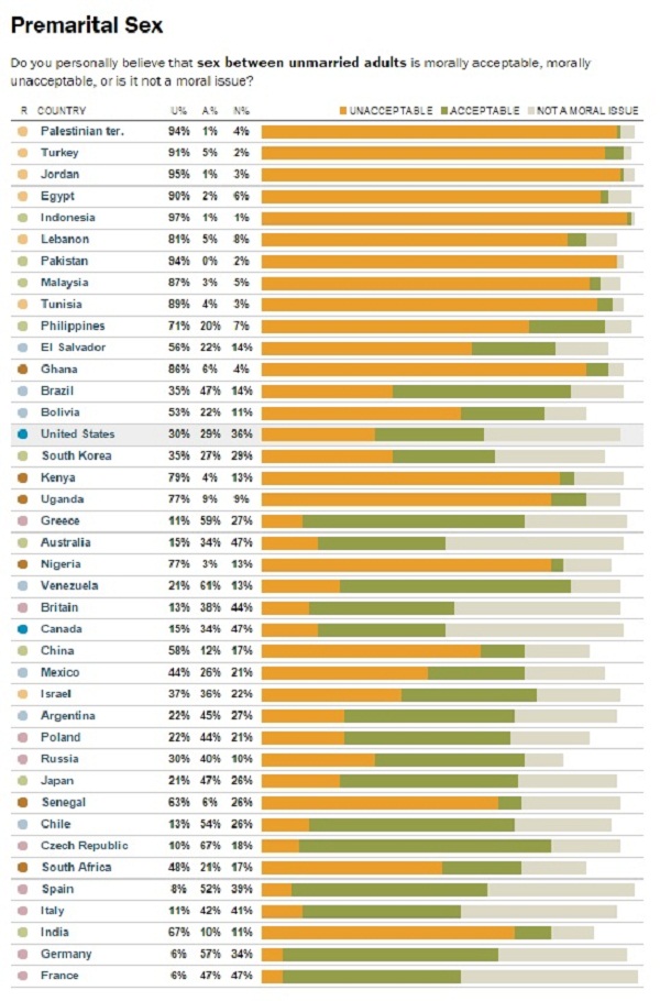 На пример за прашањето за „вонбрачните врски“, најголем процент на неприфаливост има во државите со доминатно муслиманско население.