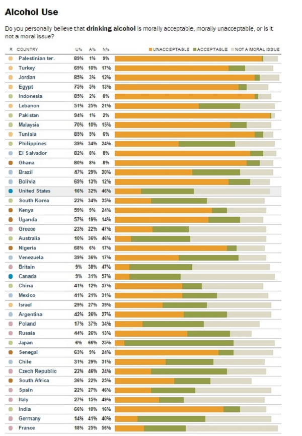 Ако се анализира прашањето за „употребата на алкохолот“, Јапонија е најлибералната држава по ова прашање. Само 6% сметаат дека „пиењето“ е неморално.