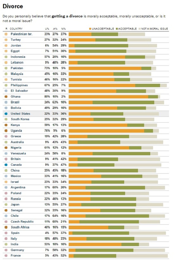 Иако само 36% од светската популација смета дека „разводите“ се прифатливи, сепак глобалната перцепција е дека тоа прашање не е во доменот на дилемата за морал или неморал.