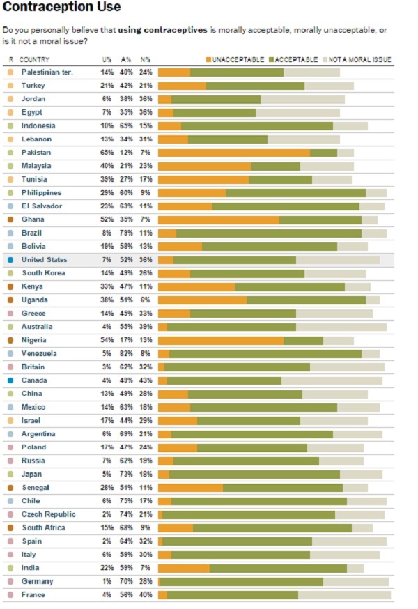Употребата на контрацептивните средства е на последната скала од ова истражување. Над 54% од светската популација тоа го смета за „прифатливо“, а само 14 % за неморално.