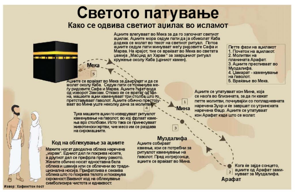 Повеќе од 800 муслимански верници следниот месец годинава ќе ја посетат Саудиска Арабија и ќе ја добијат титулата хаџи. Таму муслиманите ќе го слават и празникот Курбан-бајрам, кој годинава ќе се обележува на 11 август. Муслиманите од Македонија за светите места во Мека и Медина ќе тргнат на 30 и 31 јули годинава, а ќе се вратат на 26 и 27 август 2019 година. Превозот ќе се одвива исклучиво по авионски пат, за разлика од минатото, кога половина од пријавените муслимани оделе со автобуски превоз. Причините за тоа, како што велат од Исламската верска заедница во земјава, се воените состојби што се случуваат во околните земји.