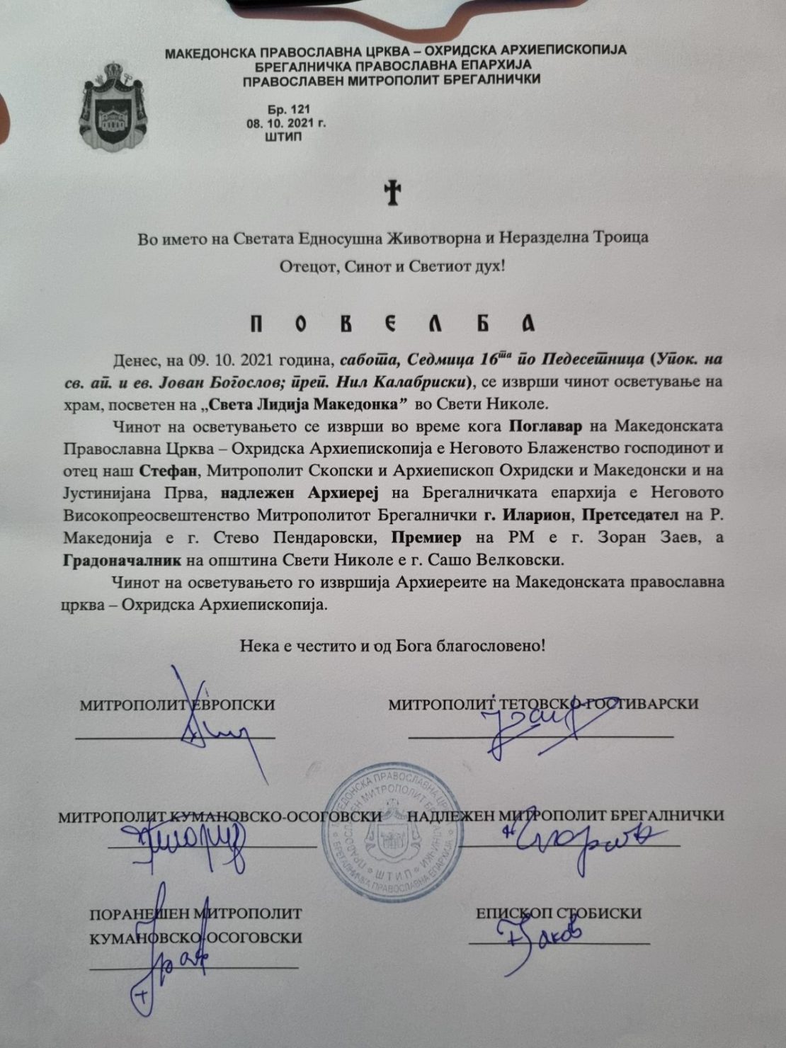 Покрај, надлежниот Митрополит г. Иларион, потпис на повелбата ставија и Европскиот г. Пимен, Тетовско-гостиварскиот г. Јосиф, Кумановско-особовскиот г. Григориј, владиката во пензија г. Јосиф и стопбискиот епископ, г. Јаков.