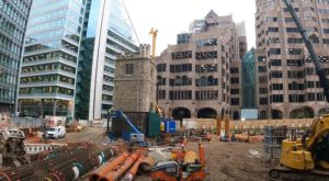 Средновековна црковна кула е подигната 14 метри над земјата за да се направи место за канцелариска кула од 60.387 квадратни метри во Лондон Сити.