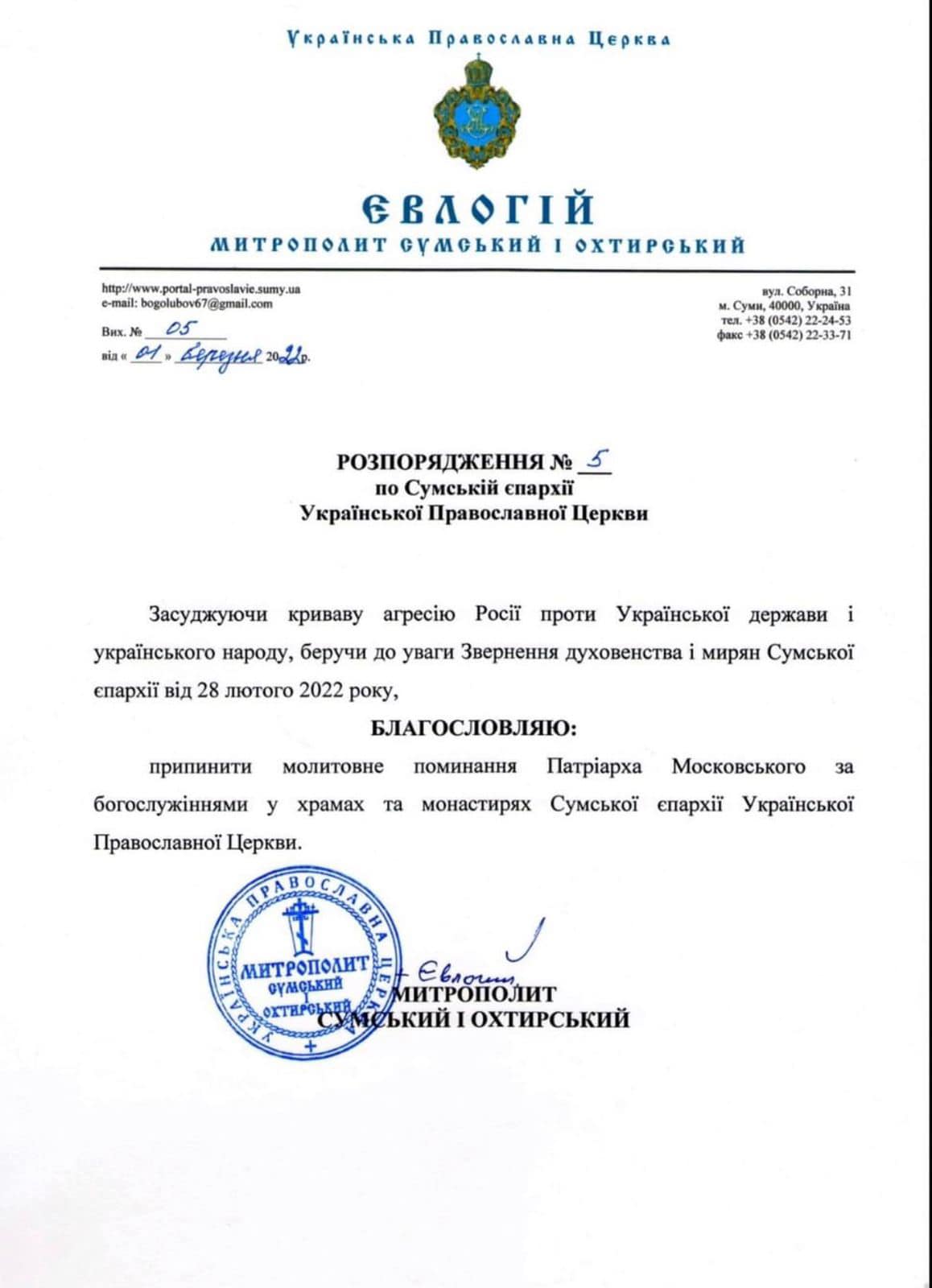 Митрополитот Евлогиј од Суминската епархија на Украинската Православна Црква – Московска Патријаршија ја прекина комуникацијата со Руската Православна Црква и издаде нарадеба со која се забранува спомувањето на Рускиот Патријарх Кирил за време на Богослужбите.