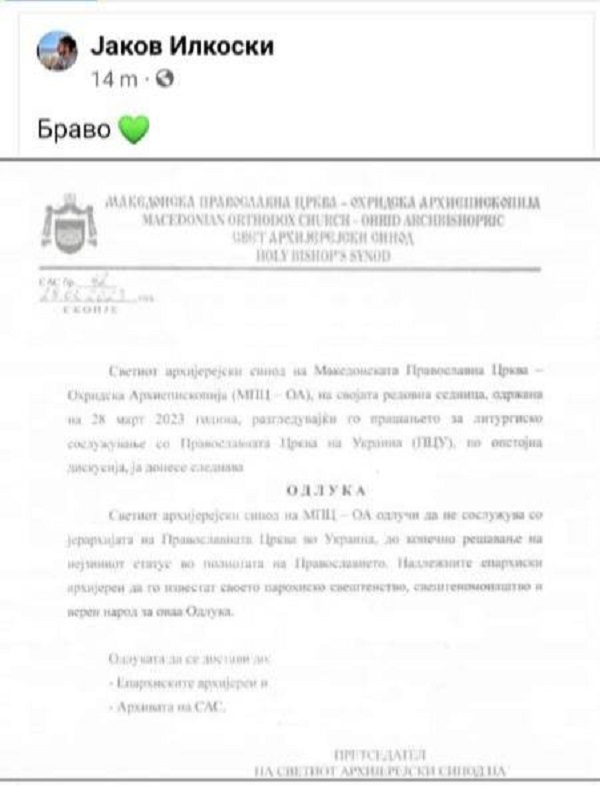 -Светиот архијерејски синод на Македонската Православна Црква – Охридска Архиепископија (МПЦ ОА), на својата редовна седница, одржана на 28 март 2023 година, разгледувајќи го прашањето за литургиско сослужување со Православната Црква на Украина (ПЦУ), по опстојна дискусија, одлучи да не сослужува со јерархијата на Православната Црква во Украина, до конечно решавање на нејзиниот статус во полнотата на Православието. Надлежните епархиски архијерен да го известат своето парохиско свештенство, свештеномонаштво и Верен народ за оваа Одлука, стои во одлуката.
