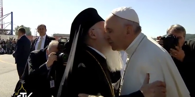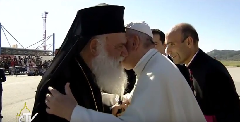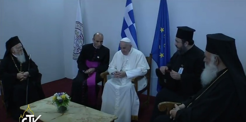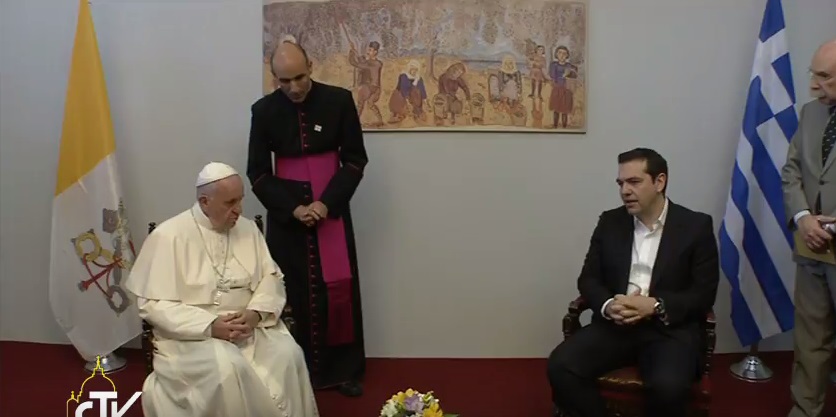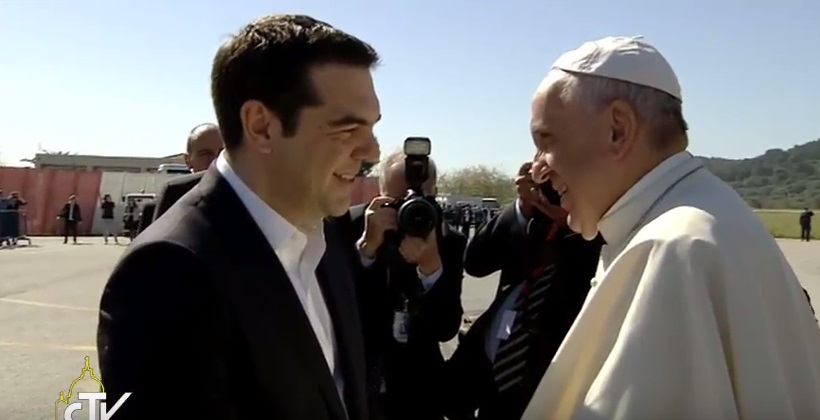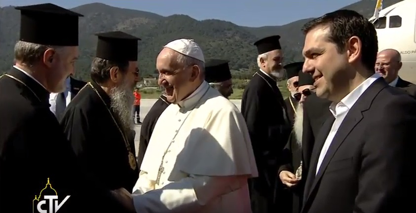 Патата Франциск во Лезбос го пречека грчкиот Премиер Алексис Ципрас, заедно со Вселенскиот патријарх Вартоломеј и грчкиот Архиепископ Јероним.