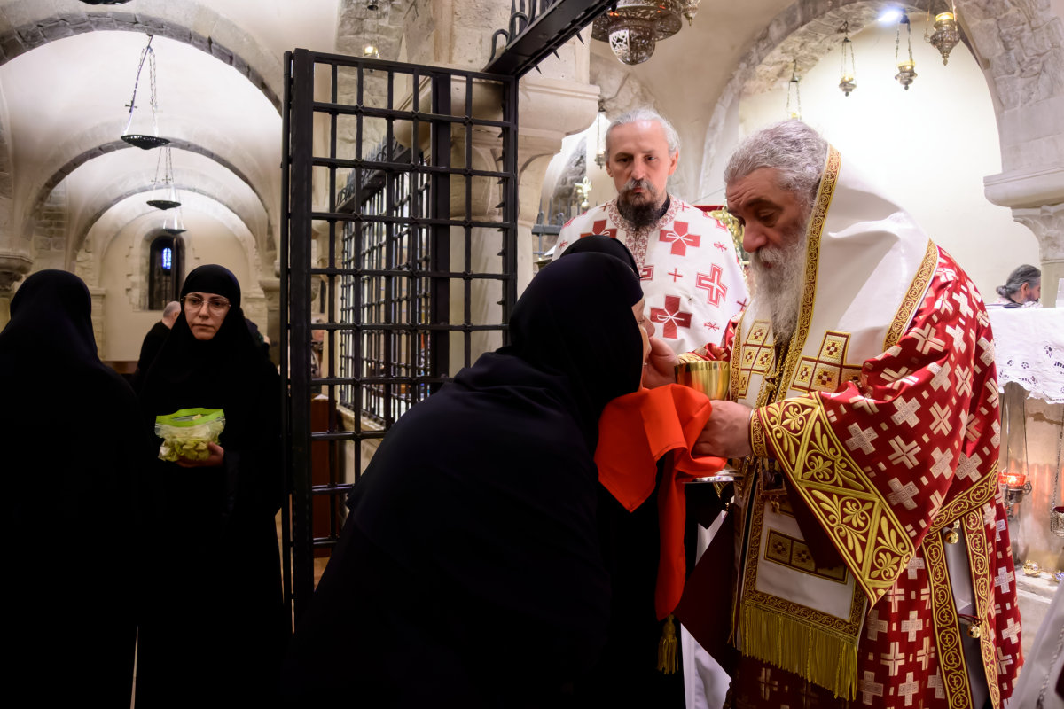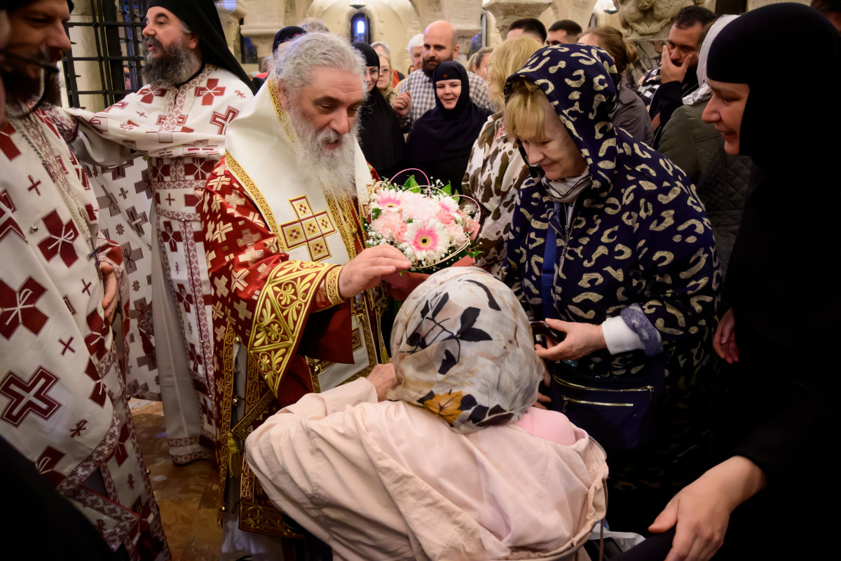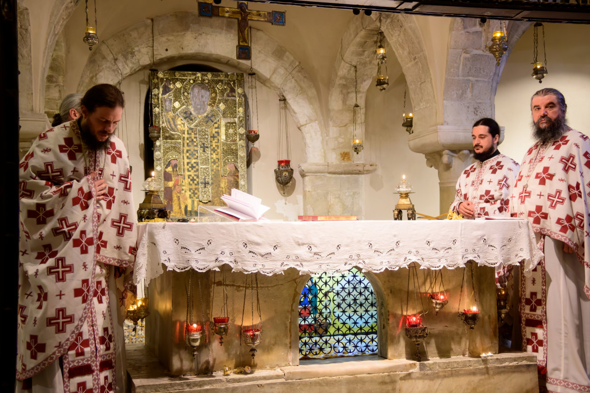 -Во подземните бедра на древната барска базилика, во мистичната полутемнина на криптата, каде што воздухот е проткаен со благоуханието на светите мошти и со молитвените воздишки на неброени столетија, Преосвештениот Антаниски ја принесе бескрвната Жртва за живот на светот, над самиот чесен гроб на Светителот. Со Старецот сослужуваа неговите браќа свештенослужители, отците Доситеј, Кирил, Анатолиј и Ефросиниј. Богослужбата беше збогатена со умилителното и благодатно пеење на дел од псалтите од хорот „Митрополит Козма Пречистански“ од Кичево, како и на нашите студенти по православна теологија при Универзитетот во Атина. А меѓу нив, заедно со сестрите монахињи и со многубројните притекнати верници, како невидлив, но жив и присутен домаќин, соучесник, сослужител и сомолитвеник беше и самиот Чудотворец – оној кого Црквата со возвишен глас го воспева како „правило на верата и образ на кротоста“, како брз застапник и топол молитвеник пред Престолот на Пресветата Троица, велат од Бигорски.