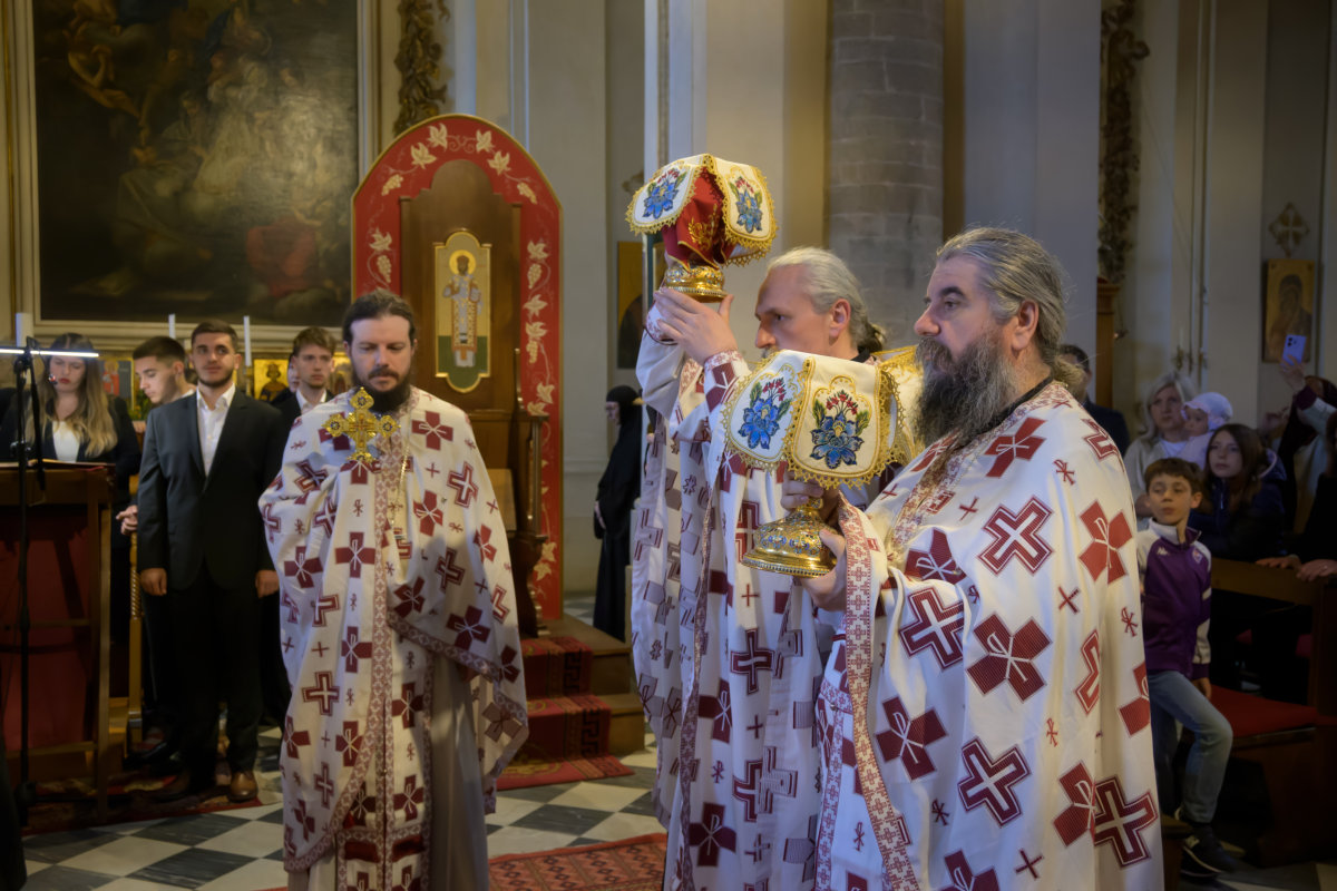 -Навистина голем и неискажлив е молитвениот восхит да се служи Светата Литургија во храм во кој сводовите вековно ги паметат шепотите на поклониците и гласовите на ренесансните мајстори, а денес одекнуваат со пасхалното „Христос Воскресе!“ Среде таквата величественост – архитектура што сама по себе е ремек-дело на христијанската свештена уметност – несетно се разбира и посилно се чувствува тоа што Христовиот верен секогаш и насекаде го носи во своето срце: дека Домот Господов е секаде еден; дека единствена и иста е и Чашата на Животот што се воздигнува под овие сводови, како и под сводовите на нашиот возљубен Бигорски манастир; дека границите на стилот, на јазикот и на епохата се само украсен превез, а Литургијата ги пробива низ сите векови, како што ги пробива сите граници, јазици и нации: „Исус Христос е Ист и вчера и денес и во веки“ (Евр 13, 8). Токму тоа беше посведочено денеска во „Свети Јаков над Арно“, каде што евангелското слово и литургиските молитви се слушнаа на шест јазици, пред едниот народ Христов, собран од различни нации и држави, велат од Бигорски.
