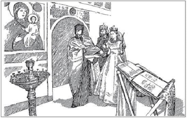 Старецот влегол во олтарот, ја облекол празничната бела одежда, запалил свеќи… Сè било како на венчавката. Го поставил парот пред амвонот, ги отворил царските двери и во рацете го зел престолното Евангелие кое тежело 16 килограми.