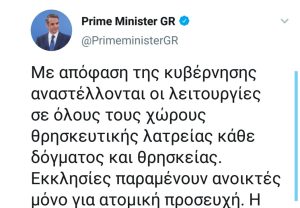 Црквите остануваат отворени само за индивидуална молитва. Заштитата на јавното здравје наметнува јасни одлуки“, напиша Мицотакис на „Твитер“.