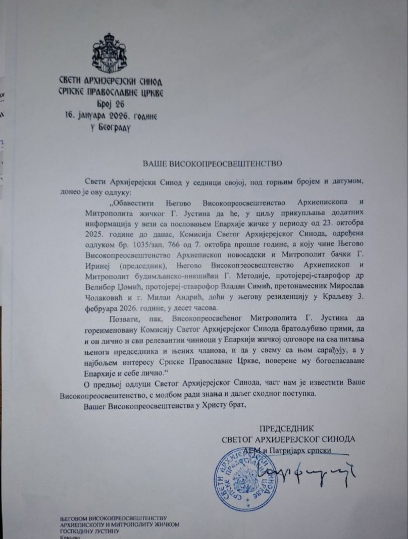 Неговите поддржувачи објавија ново писмо од патријархот Порфириј, според кое утре во Краљево повторно пристигнува комисија на СПЦ, предводена од Бачкиот епископ Иринеј БУловиќ. Целта на комисијата е повторно да ја чешла документацијата на епархијата.