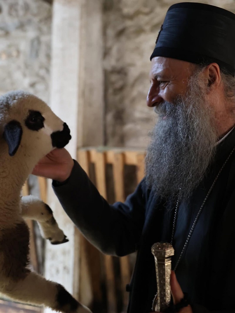 Српскиот патријарх Порфириј на својата фејсбук страница сподели фотографии сликан со јагниња и телиња, од посетата на имотот на манастирот Високи Дечани на Косово.