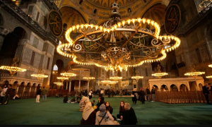 Одлуката на двајца грчки туристи да развиорат знаме со византискиот двоглав орел во внатрешноста на Света Софија во Цариград заврши со судски последици.